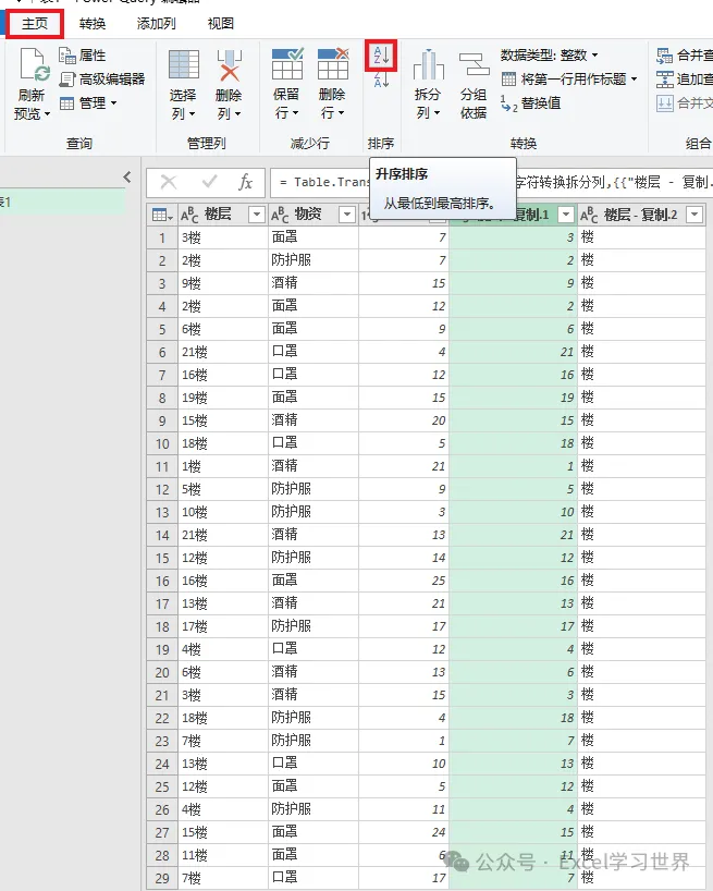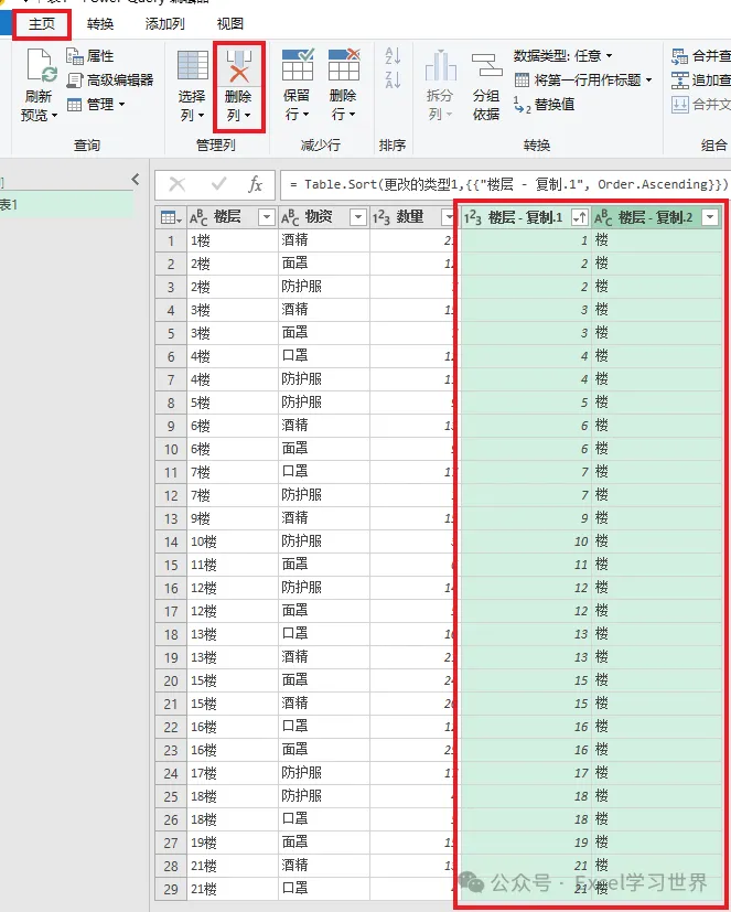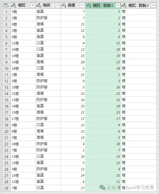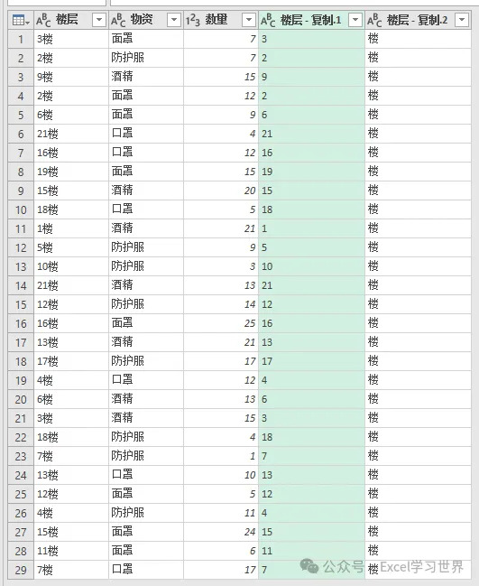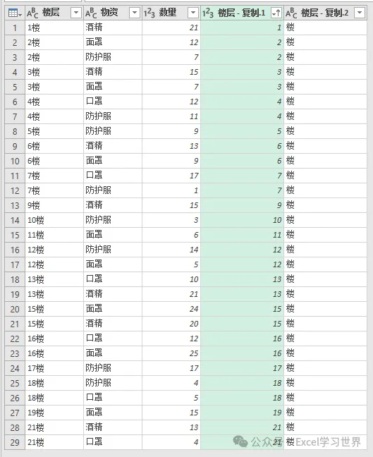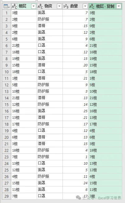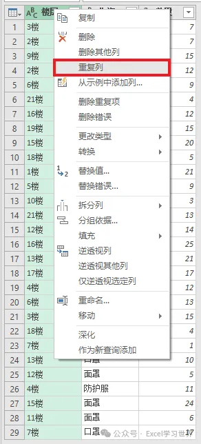 3. 选中“楼层”列 --> 右键单击 --> 在弹出的菜单中选择“重复列”
