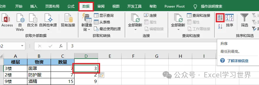 3. 选中 D 列的任意单元格 --> 按升序排序