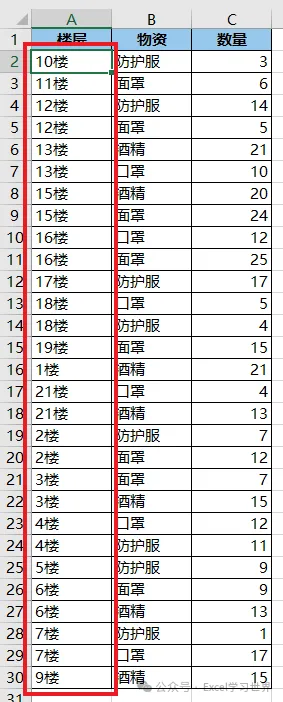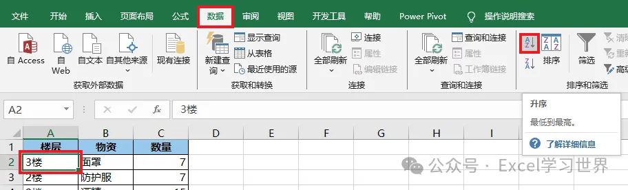 1. 选中 A 列的任意单元格 --> 按升序排序
