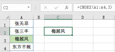 例如以下公式,用于返回A1:A4单元格区域中的第3个元素,即A3单元格的内容。