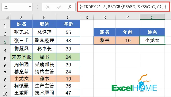 如下图所示,需要根据E列和F列的职务和年龄信息,在A~C列单元格区域中,查找职务为“秘书”,年龄为“19”岁所对应的姓名。