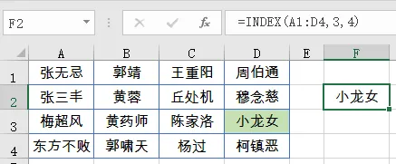 例如以下公式,用于返回A1:D4单元格区域第3行和第4列交叉处的单元格,即D3单元格。