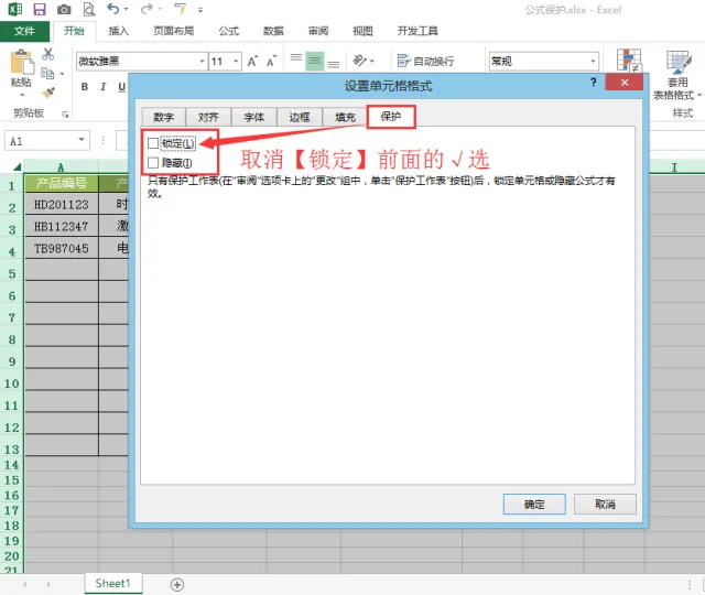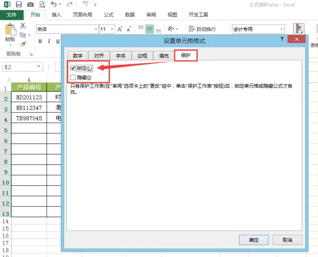 4、接着按Ctrl+1调出【设置单元格格式】,勾选【锁定】,然后点【确定】。