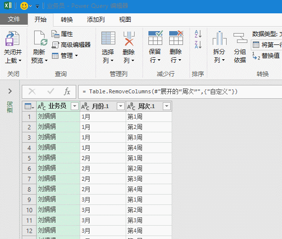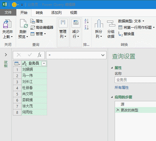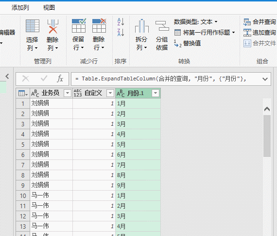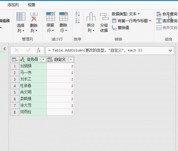 单击“业务员”表,单击【添加列】,自定义列公式为: