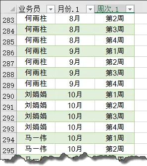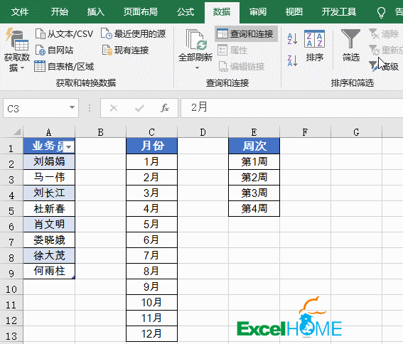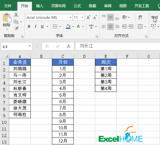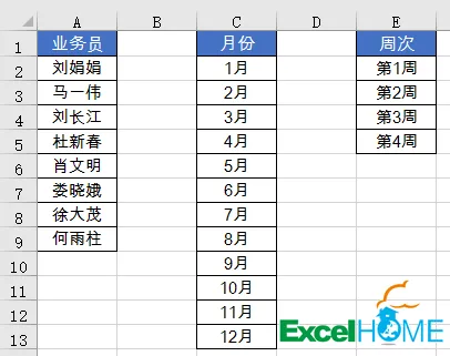 如下图所示,A列是一组业务员姓名,C列是月份,E列是周次。现在咱们要得到这些数据的所有组合,即每个业务员与12个月分别组合,每个月再与四个周次分别组合。