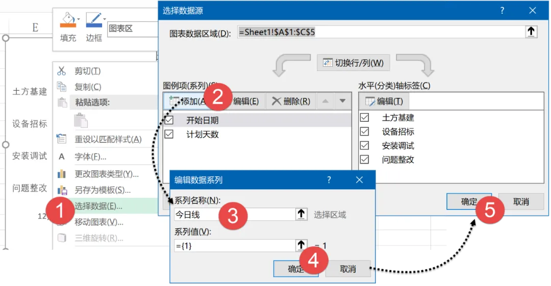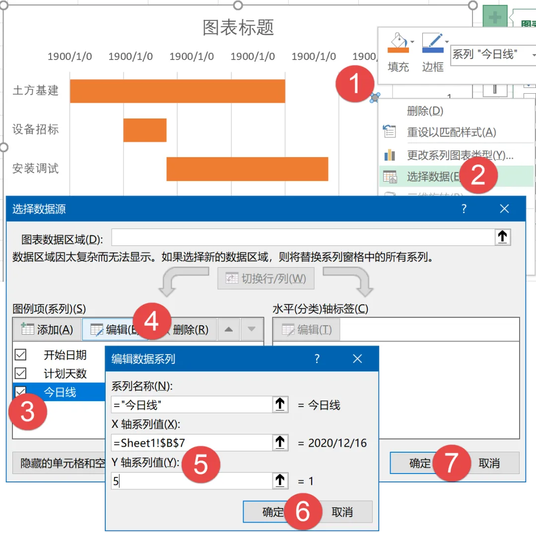 右键单击图表→【选择数据】,在【选择数据源】对话框中单击选中“今日线”系列,再单击【编辑】按钮,x轴系列值选择B7单元格中的今日日期,Y轴设置为5。