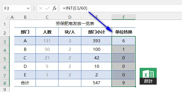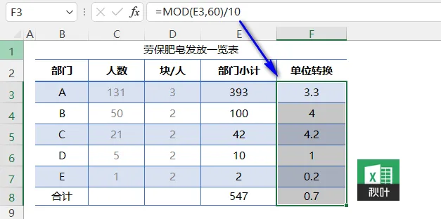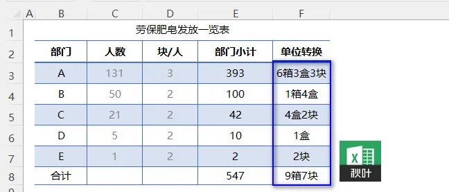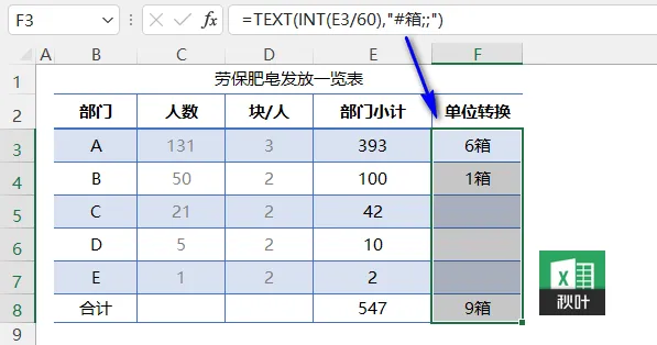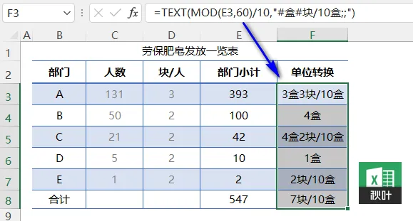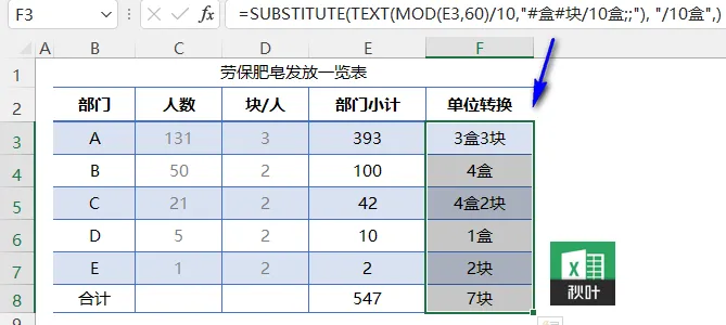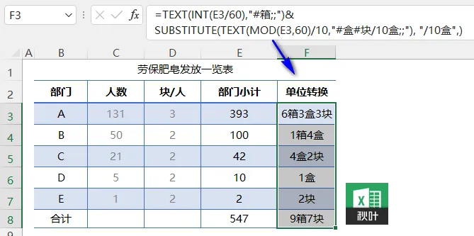 TEXT 函数可以将数字转化为自己想要的文本格式。如下图,公司为了方便发放物资,需要将各部门小计的数量,单位转换后按部门发放。效果如 F 列所示。(其中单位换算关系为:每箱 6 盒,每盒 10 块。)=TEXT(INT(E3/60),"#箱;;")&SUBSTITUTE(TEXT(MOD(E3,60)/10,"#盒#块/10 盒;;"),"/10 盒",)