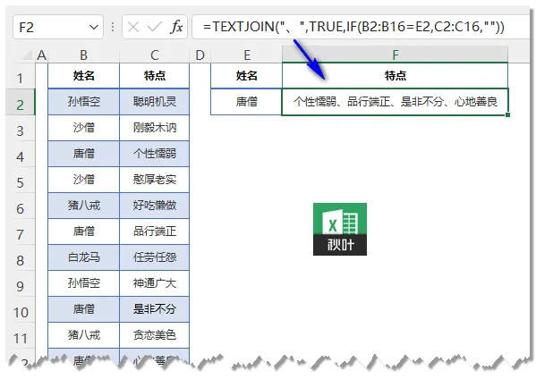 TEXT 函数通过第 2 参数格式化代码,对数字格式化,从而更改数字的显示方式。它的用法是:=TEXT(数字,格式代码)TEXT 函数的格式代码与单元格自定义格式代码类似。它分为 4 个条件区段,各区段之间用半角分号间隔:[条件 1];[条件 2];[不满足条件 1 和条件 2];[文本]然后用 TEXT 函数通过格式代码"#箱;;"显示值的方式:如果是正数则显示多少箱,如果是 0 则不显示。6 是正数,结果显示 6 箱。❷ TEXT(MOD(E3,60)/10,"#盒#块/10 盒;;")MOD(E3,60)表示除去整箱数之后,还剩 33 块。除以 10 转化成小数多少盒,结果为 3.3。然后 TEXT 函数将这个值转化成以 10 为分母的分数格式(如:3 3/10),得到结果 3 盒 3 块/10 盒。再用 SUBSTITUTE 函数将多余的文字"/10 盒"替换为空字符。❸ 最后将 TEXT(INT(E3/60),"#箱;;")和 TEXT(MOD(E3,60)/10,"#盒#块/10 盒;;")用连接符号「&」连接起来,得到最终单位转换的结果。如下图,需要根据 E2 单元格的姓名,把 B 列包含该姓名的所有特点,都合并到右侧 F2 单元格里,中间用顿号(、)隔开。这个时候我们就可以直接使用 TEXTJOIN 函数完成工作。这个函数是 Office 2016 版本新增的文本合并函数。有了这个函数,单元格文本合并就变得轻松简单了。=TEXTJOIN("、",TRUE,IF(B2:B16=E2,C2:C16,""))