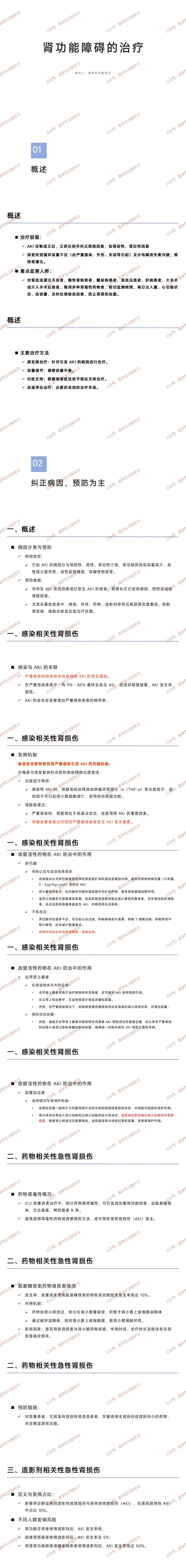 对存在 AKI 高危因素或已发生 AKI 的患者,需纠正已发现病因,预防或减轻肾脏损害;重症患者中,需高度重视感染、休克、药物、造影剂等常见病因,控制原发病、遏制炎症反应是治疗关键。