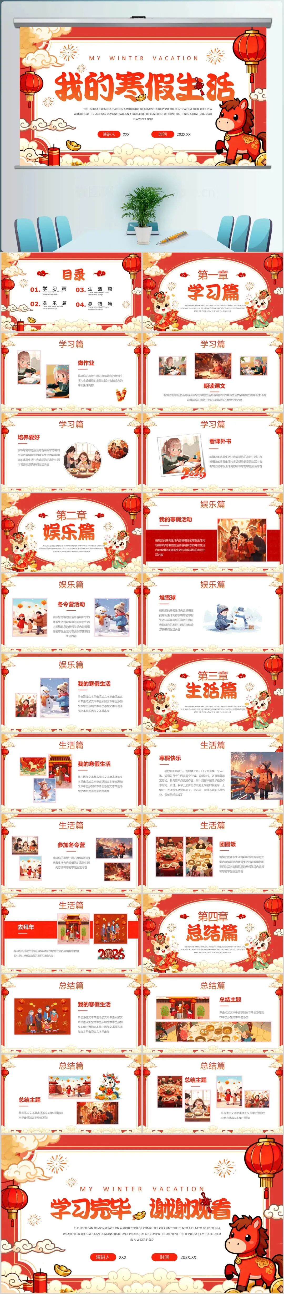 2026卡通马年我的寒假生活介绍PPT 本次课程演讲,主要采用简约设计风格,可编辑修改内容,课程分为:XX页,软件:PowerPoint (.pptx) 用于演讲,学习用途等 课件动态PPT制作,完美动画展示