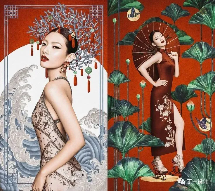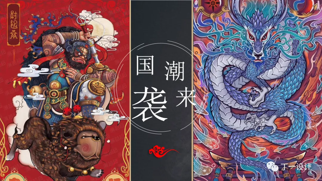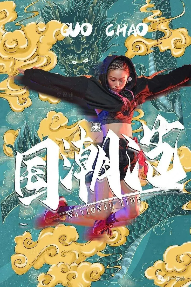 国潮风是潮流设计中融入中国元素,更偏向于“潮”这个字,也就是本质上依然很前卫。中国风是建立在中国或东方传统文化的基础上,以中国元素为表现手段的一种艺术形式或生活方式,是根植于中华民族发展历史中的意识形态与传承理念,并不是说国潮就一定得是中国风。国潮风主要创作题材元素都来自于我国传统的历史文化,通常会使用大量的传统中式图腾元素,例如云雷纹、水纹、龙、舞狮等等。在构图上,国潮风格常会选择充满版的方式,将诸多元素聚在一起,显得热闹喜庆,或者突出主要元素,将细节充分显示。