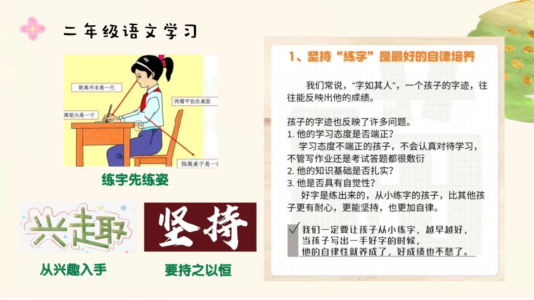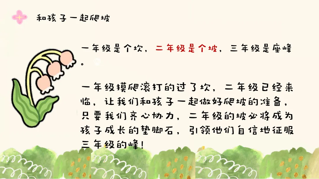 一年级摸爬滚打的过了坎,二年级已经来临,让我们和孩子一起做好爬坡的准备,只要我们齐心协力,二年级的坡必将成为孩子成长的垫脚石,引领他们自信地征服三年级的峰!
