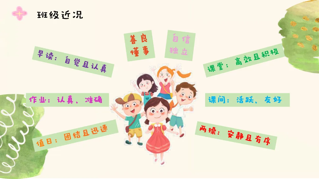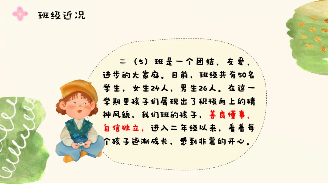 我们的班级是一个团结、友爱、进步的大家庭。目前,班级共有50名学生,女生24人,男生26人。在这一学期里孩子们展现出了积极向上的精神风貌,我们班的孩子,善良懂事、自信独立,自上个学期以来,看着每个孩子逐渐成长,感到非常的开心。