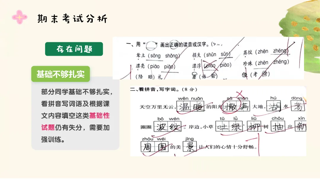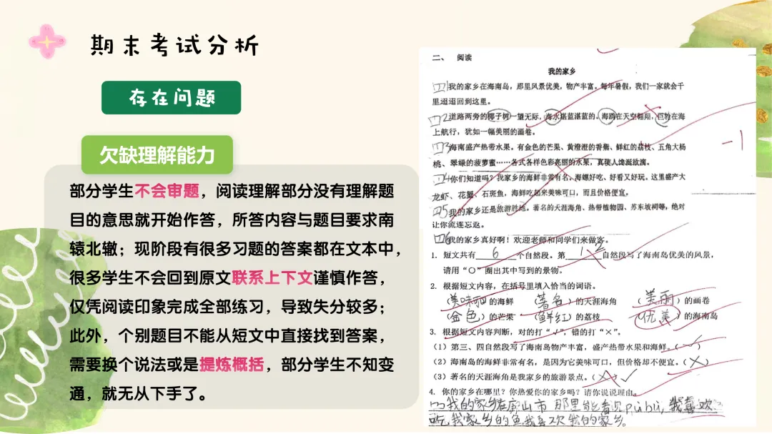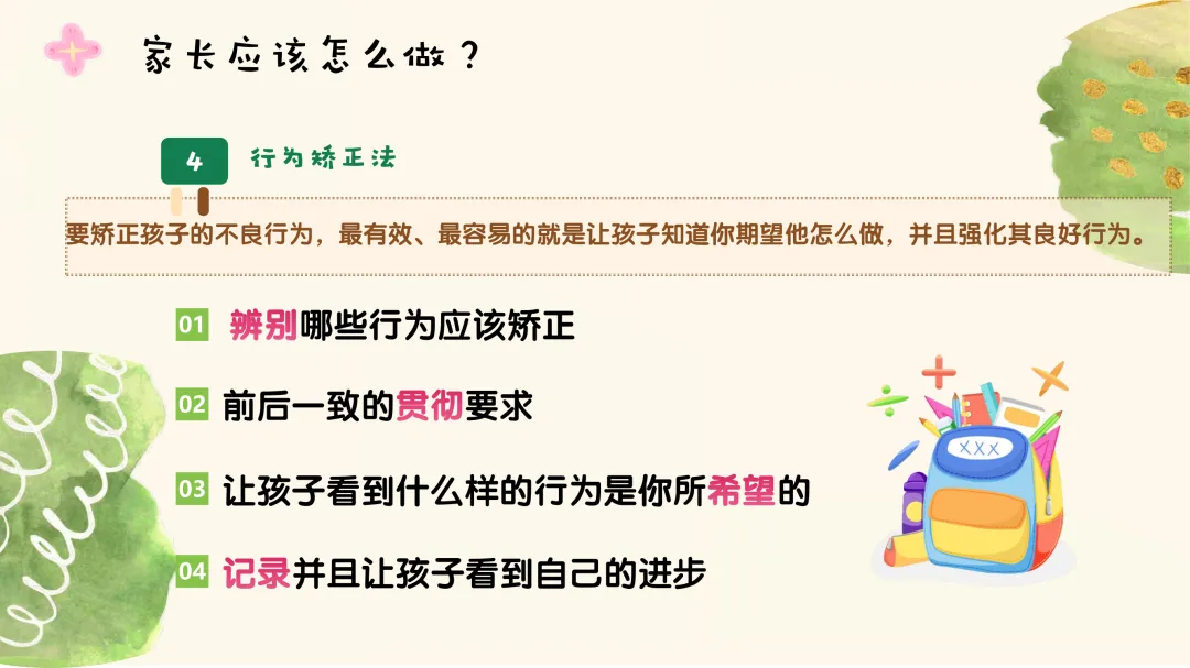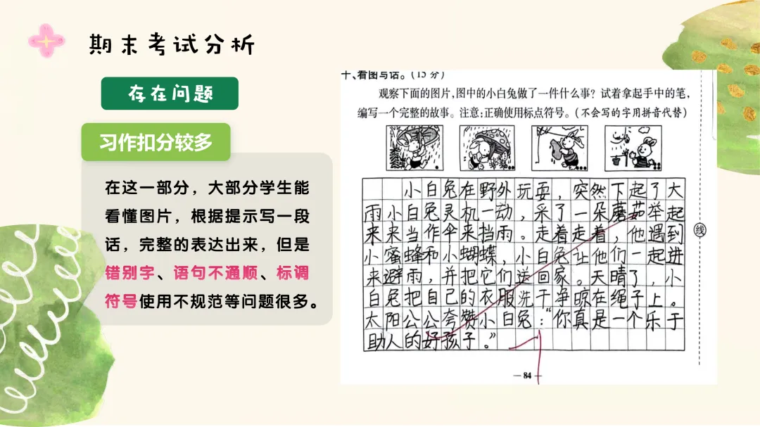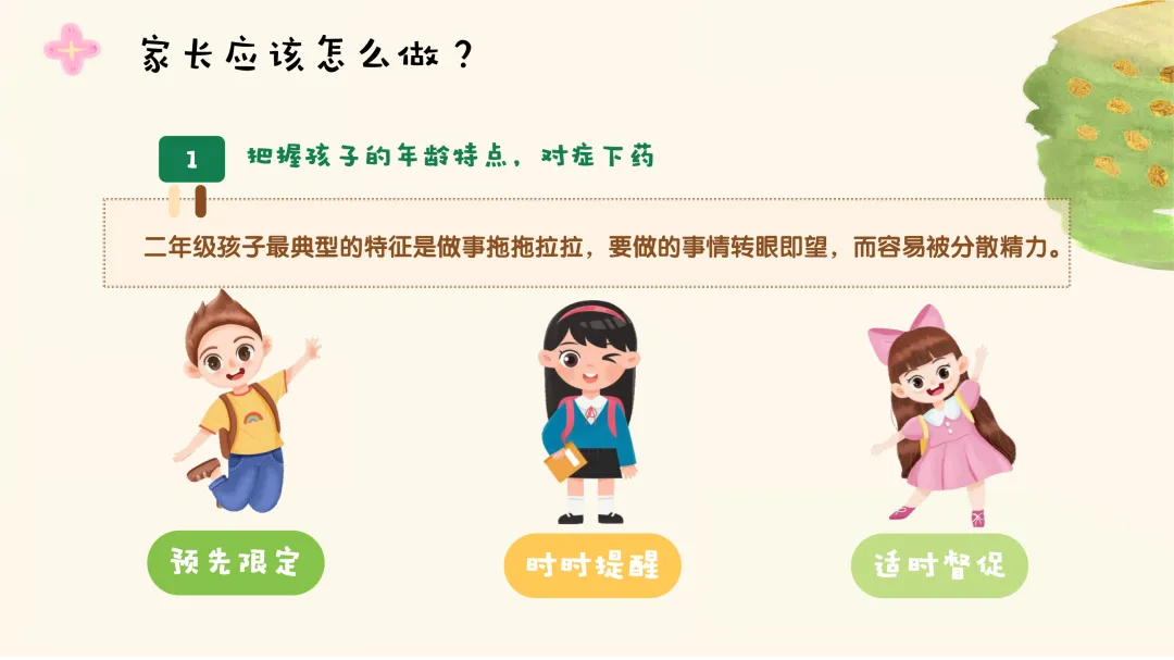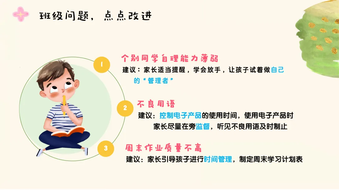 (1)个别同学自理能力薄弱,收纳整理和卫生习惯较差。丢三落四的现象比较严重,一会儿书本忘在家里了,一会儿作业本找不到了。(建议:家长适当提醒,学会放手,让孩子试着做自己的“管理者”)