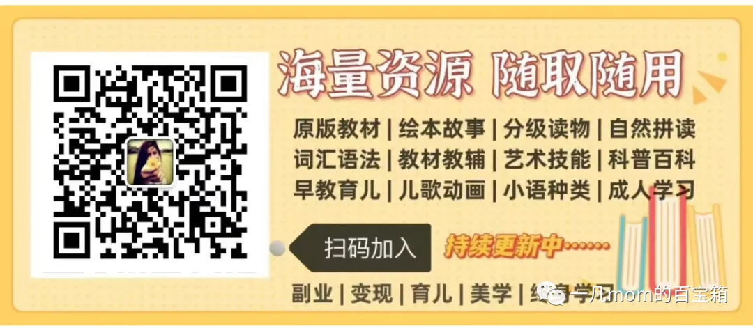 大家好,很高兴认识你!一凡麻麻是一名80后妈妈,欢迎大家关注我的公众号【一凡mom的百宝箱 】,在这里我每天为大家分享免费的适合0-12岁小朋友的宝藏资源。我们有专业的资源共享群,想入群的朋友请加我微信yifan200323