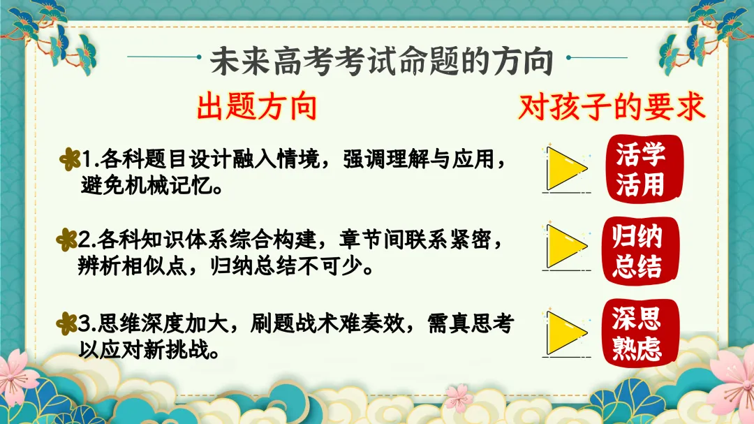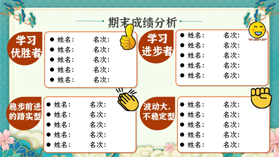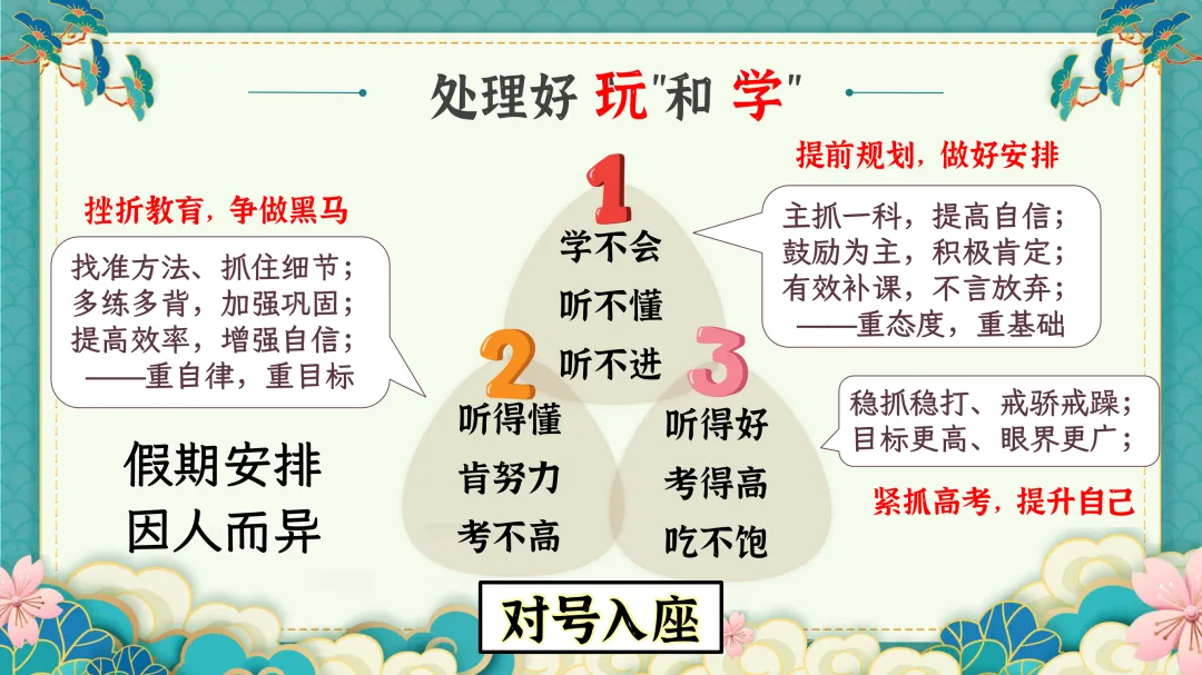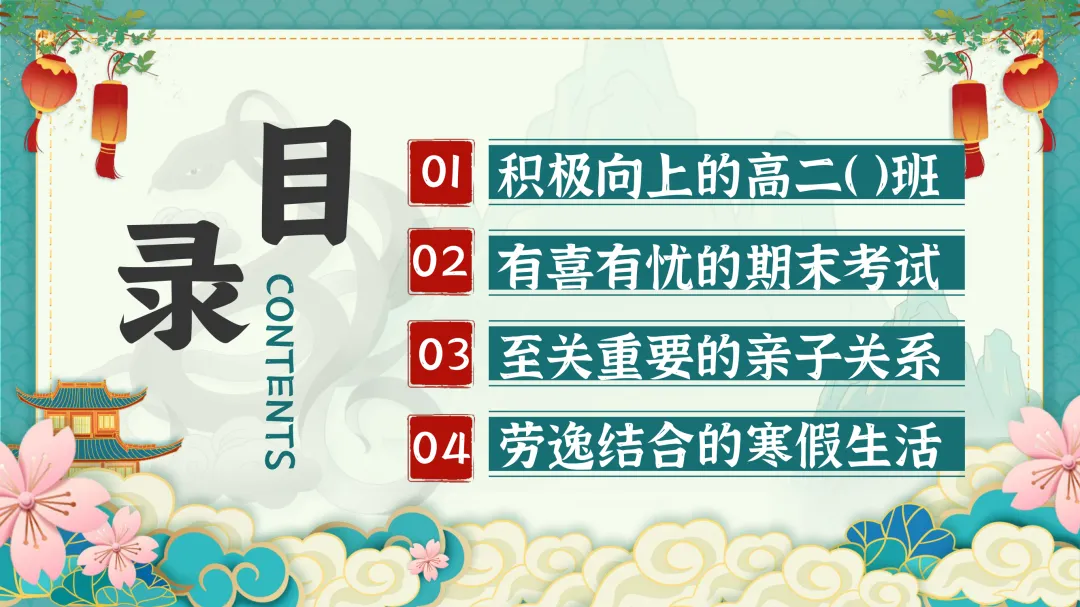 在这关键的高二阶段,教育的协同力量至关重要。此刻,站在学期尾声,我们相聚于此,就是要静下心,一同回望高二这一路的风景与坎坷,精准把握孩子们当下的学习、生活与心理状态。本次家长会主要内容分4部分:01积极向上的高二( )班;02有喜有忧的期末考试;03至关重要的亲子关系;04劳逸结合的寒假生活。