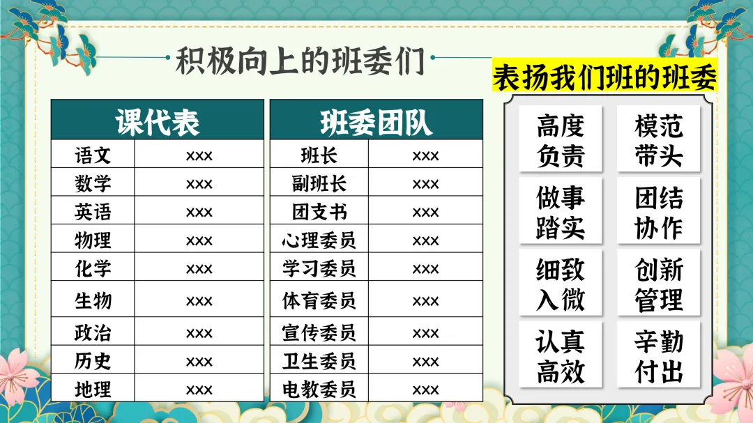 班长:xxx;副班长:xxx;团支书:xxx;心理委员:xxx;学习委员:xxx;体育委员:xxx;宣传委员:xxx;卫生委员:xxx;电教委员::xxx