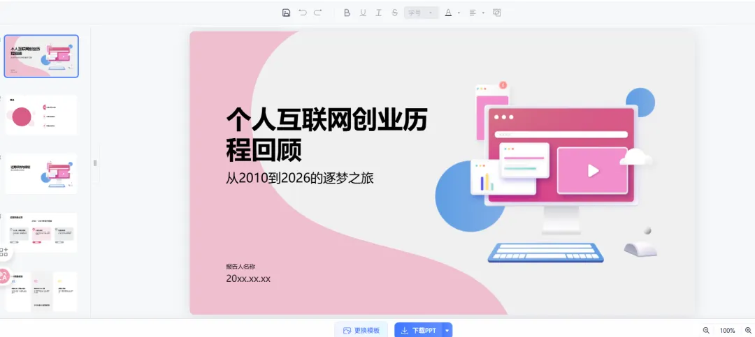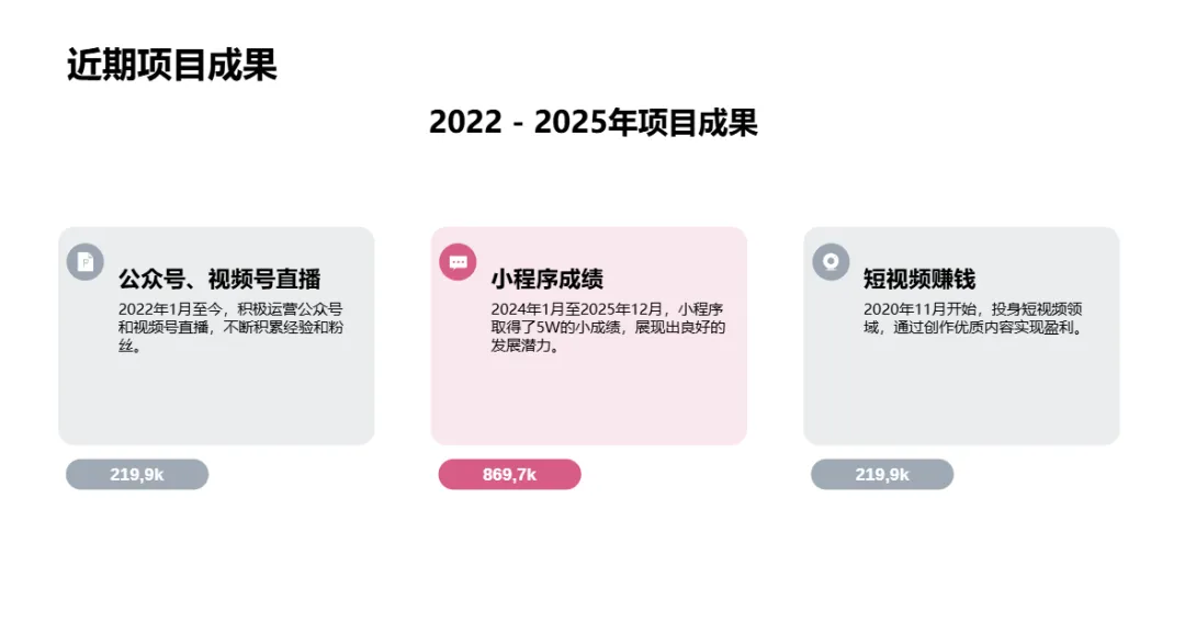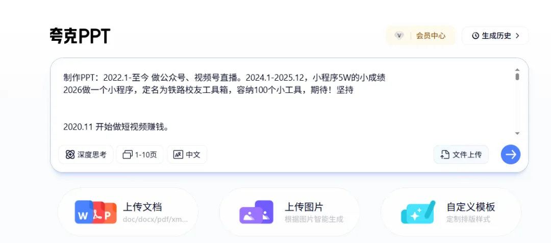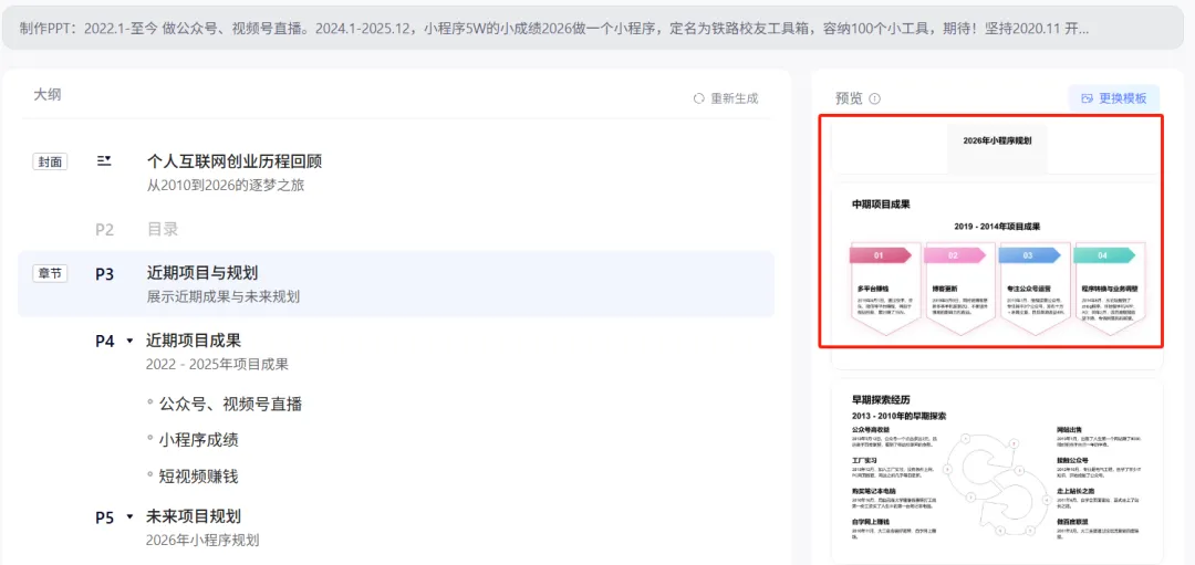 写在开头,宣布一件事:今年计划,我将亲自下场,直接实际接触AI,与大家分享一些实践,实操AI带来的新工具和新感受,你可以从我的原创文章中大致描述了我的一些经历,我需要他帮我生成一个2025年以前的副业经历的PPT,做为我下次直播的一些辅助材料。我略微的进行了调整,因为我觉得他2022的理解有一定偏差这个质量还不错吧,关键是,模板是我所喜欢的简洁性,而且这件事要是放在两年前,我应该会大致做以下几件事:1.先去PPT模板网站找一个好看的模板。(保底30分钟)2.把自己的内容先整理出来,再套到模板中。(保底30分钟)3.删除掉不必要的模板,再检查一遍(保底19分钟)这个网站推荐给大家https://ppt.quark.cn/ 收藏防止找不到了!