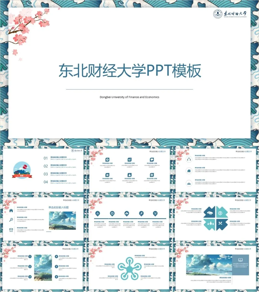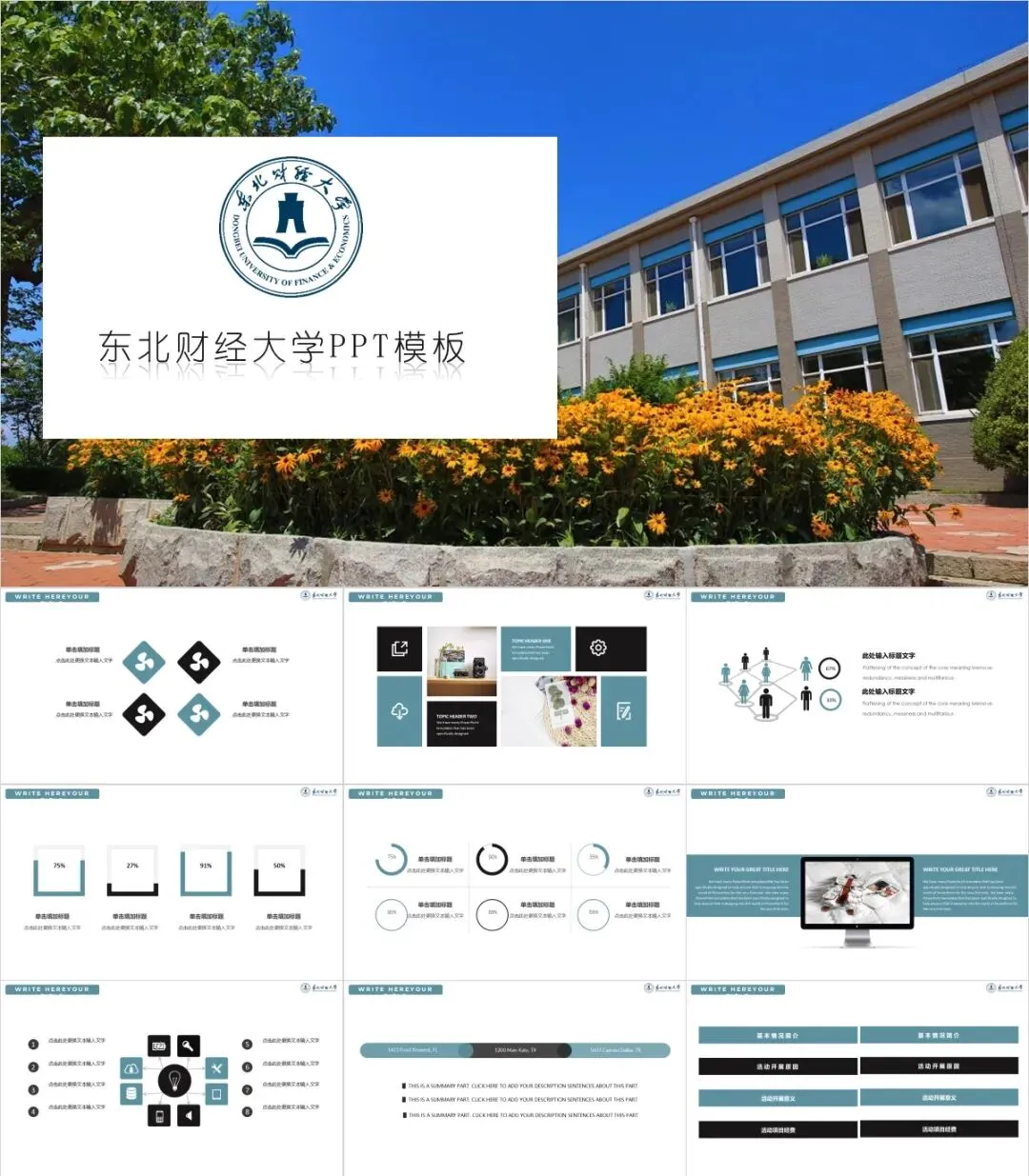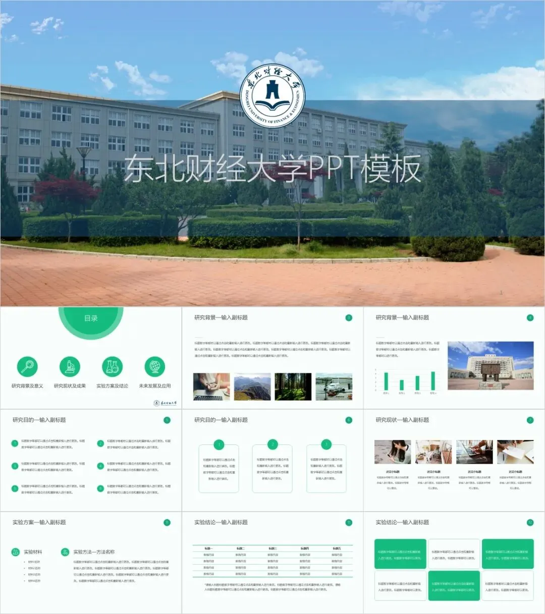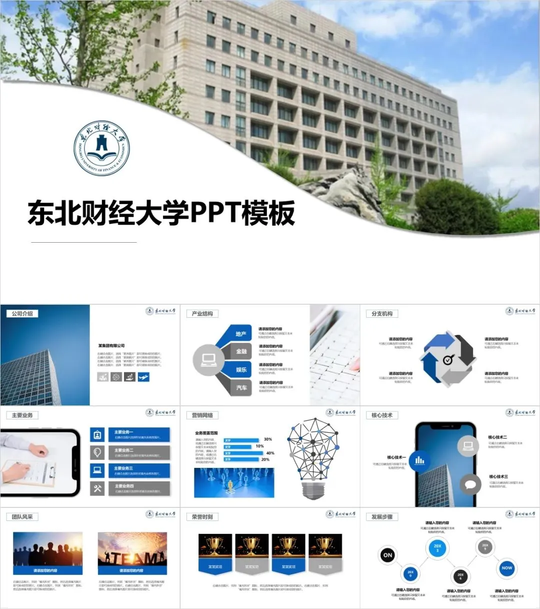 以上是我们为大家准备的东北财经大学专属PPT模板,文中的所有板式都是可编辑的,大家可以上传替换自己喜欢的校园美景,做出具有自己风格的专属PPT哦!其他同学也可以给我留言