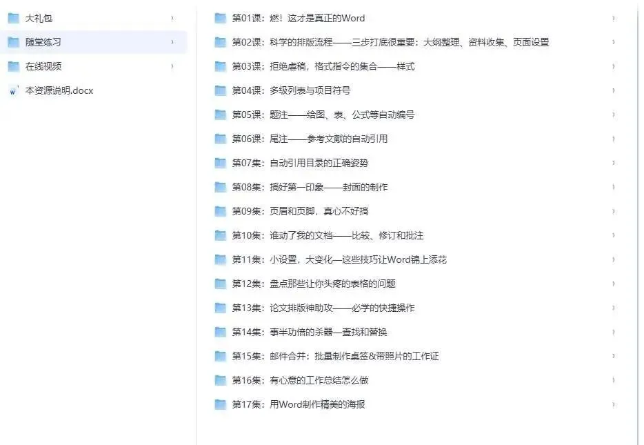 - 第01课:明确Word的进阶应用方向,帮助用户建立对Word高阶功能的认知,区分基础与进阶操作的差异。