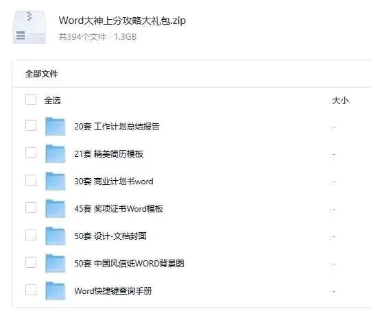 本资源为Word大神上分攻略大礼包,包含394个文件共1.3GB,内容涵盖Word实用模板集合、18节Word进阶视频课程及配套辅助资料。模板类包含20套工作计划总结报告、21套精美简历等多类文档模板;视频课程覆盖排版流程、样式设置等Word高阶操作;另有快捷键手册、随堂练习等资料。它适用于职场办公人员、学生等需要提升Word技能或快速获取办公模板的人群,可帮助用户提升Word操作效率,便捷完成各类文档的制作。