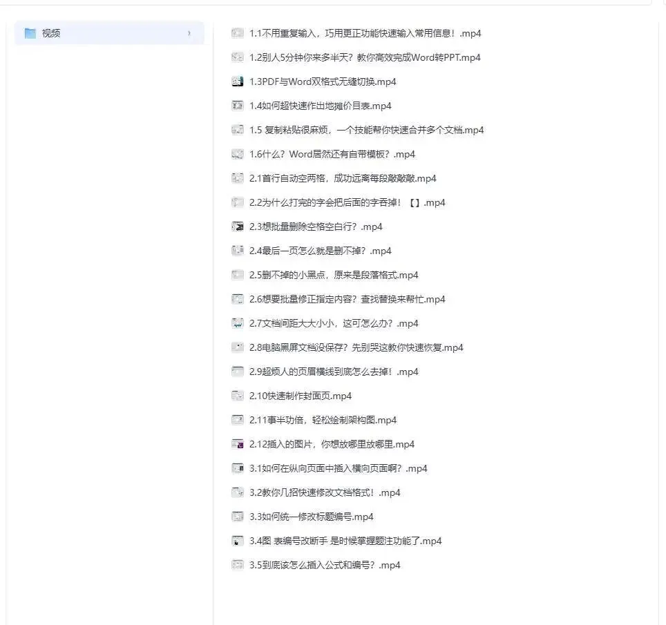这是一套面向Word小白的实用操作视频教程,以“珍妮带你告别小白”为主题,内容聚焦Word办公中的高频操作场景。教程以单个具体问题为核心制作视频,涵盖快速输入、格式转换、文档编辑、排版优化等多类实用技巧,通过直观演示的形式,帮助用户解决重复录入、格式错乱、排版低效等办公痛点,适用于职场新人、学生及各类需提升Word操作效率的办公人员。