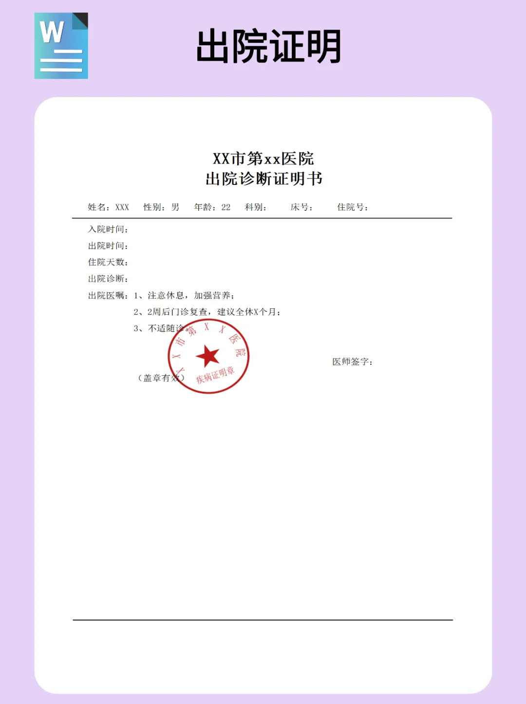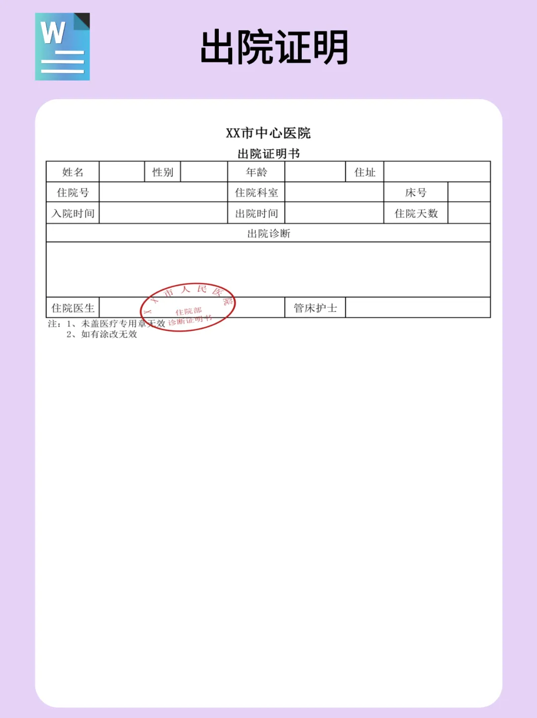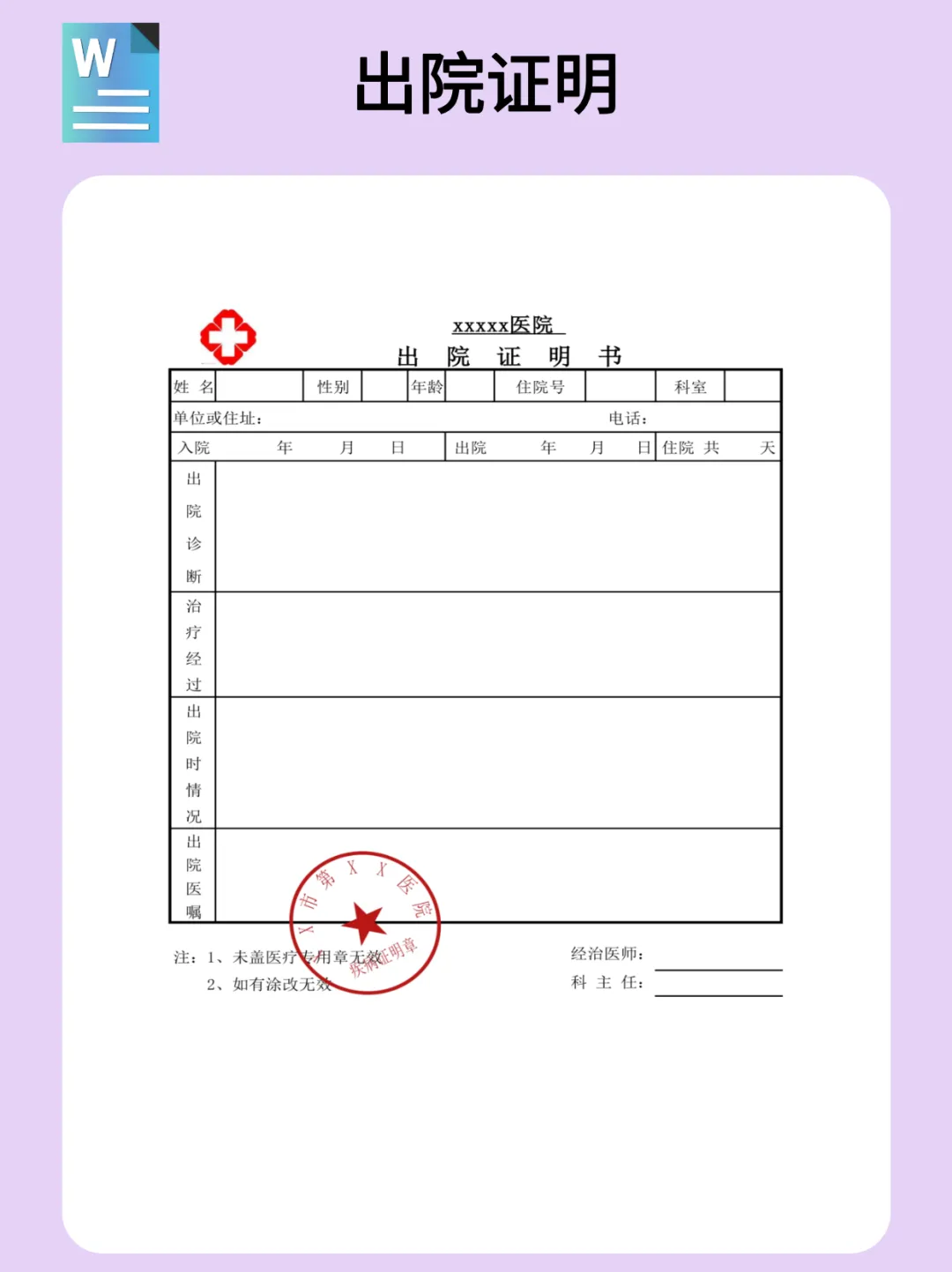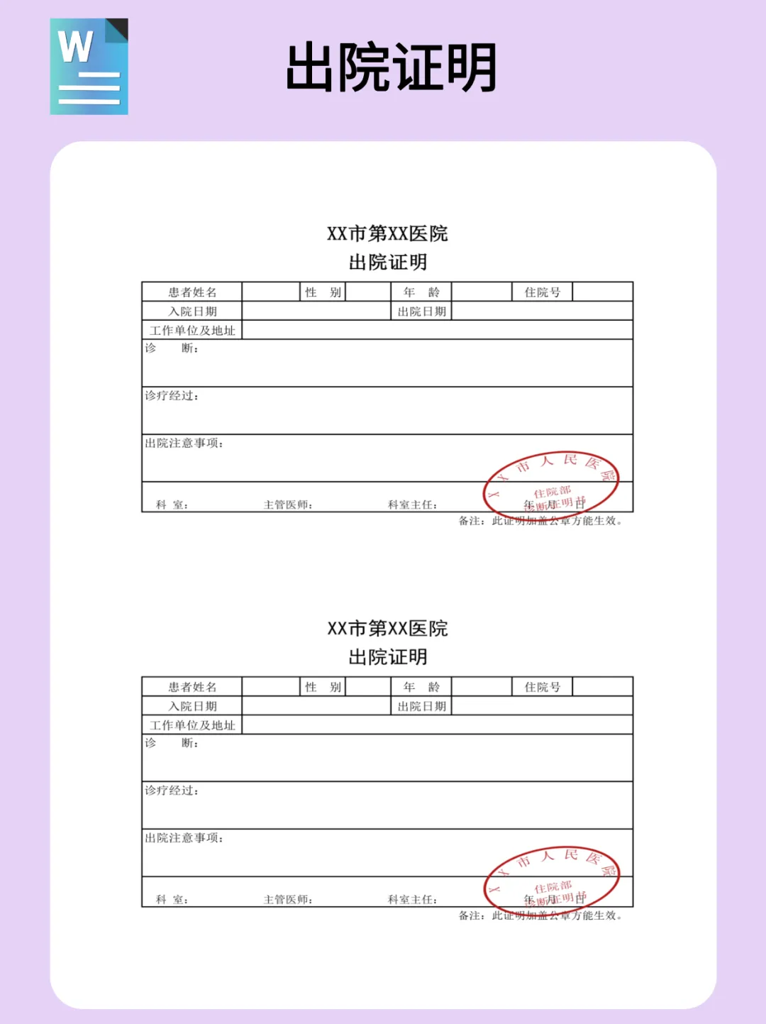 【出院证明】12款医院出院证明模板,WORD文档电子版,可自行编辑打印,夸克网盘免费分享下载!