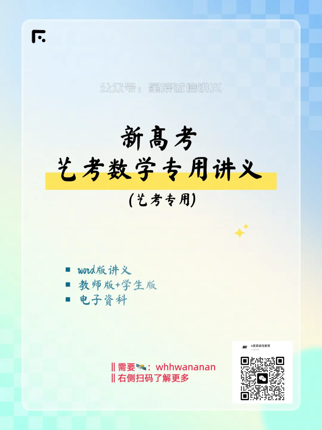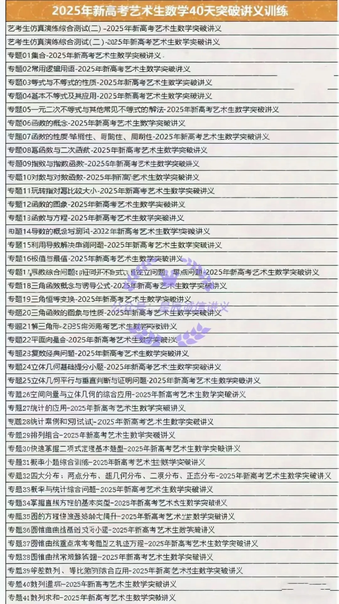🚀艺考生看过来!📚这份讲义内容超全,从集合、函数、导数,到三角函数、立体几何、概率统计,再到数列专题,系统覆盖高考核心考点✨专为艺术生设计,知识点分模块精讲,搭配仿真测试,帮助夯实基础、强化弱项🕰️40天科学规划,循序渐进,助力高效备考,冲刺理想分数!