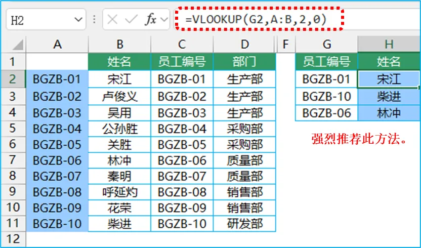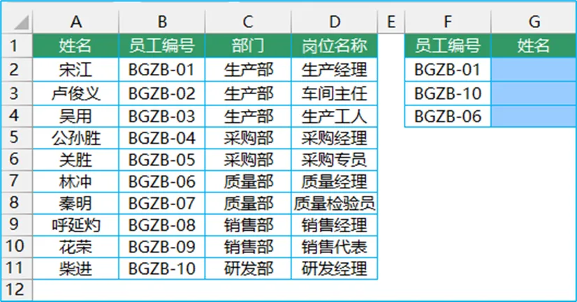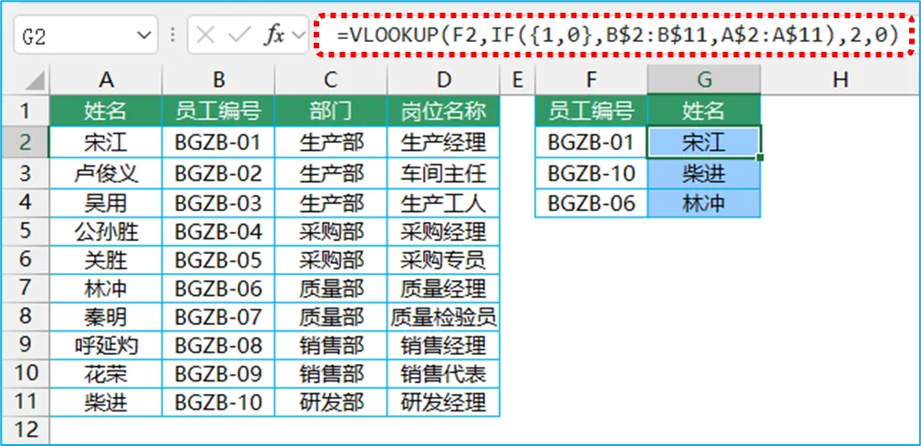 在A-D员工信息表中,需要根据F列的员工编号,返回员工姓名,这个就是 VLOOKUP 的逆向查询。=VLOOKUP(F2,IF({1,0},B$2:B$11,A$2:A$11),2,0)