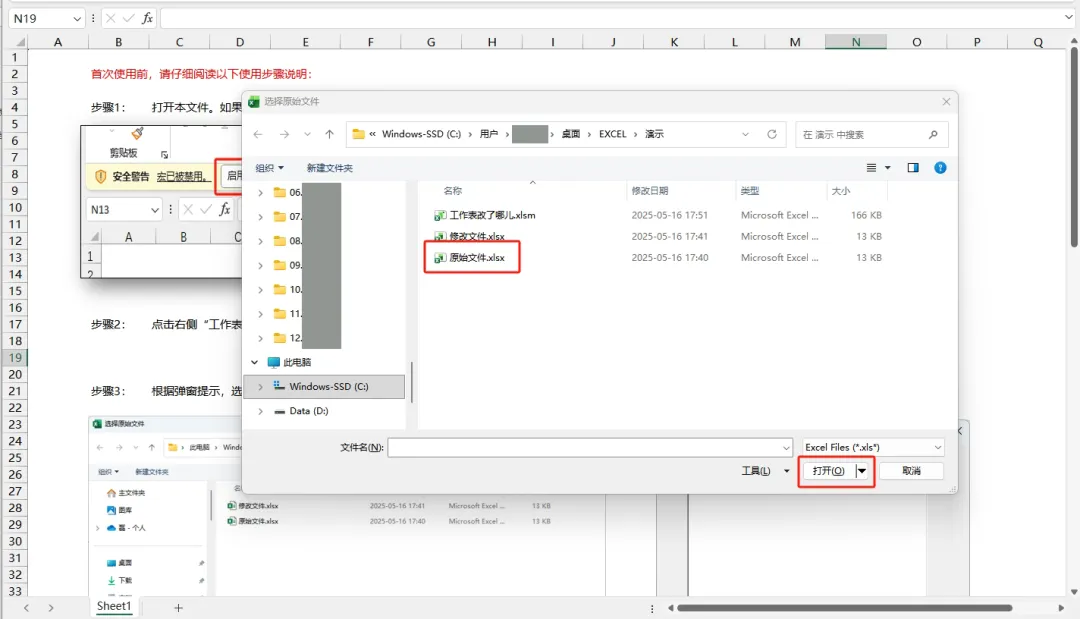 第一次弹窗,要求选择原始文件,选中并打开后,再次弹窗选择原始工作表。
