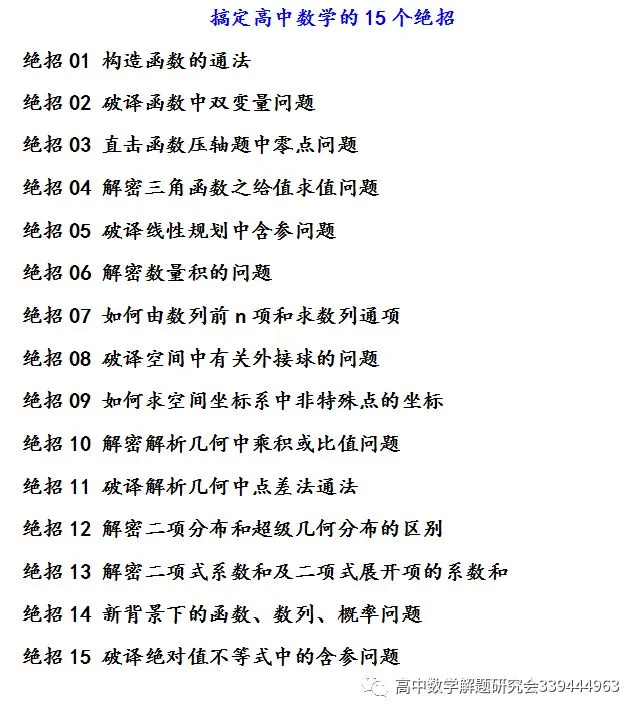 高中数学解题研究群416652117推送高考范围内的知识点总结、常用结论、典型题、常考题、解题技巧和解题思想等等,谢谢您的关注和支持。由QQ群高中数学解题研究群416652117团队创作和管理。