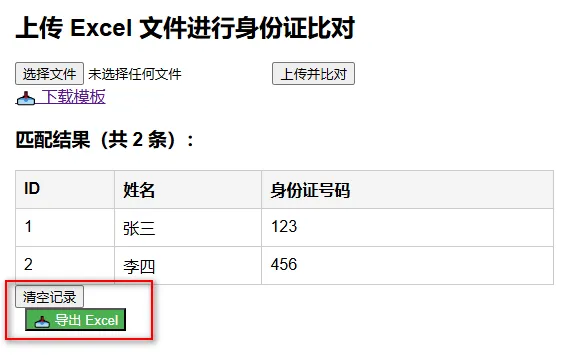 <!-- 清空按钮 --><divclass="actions"><buttontype="button"onclick="window.location.href='/clear'">清空记录</button></div><!-- 导出按钮 --><buttontype="button"onclick="window.location.href='/export-results'"style="margin-left: 10px; background-color: #4CAF50; color: white;"> 📥 导出 Excel</button>