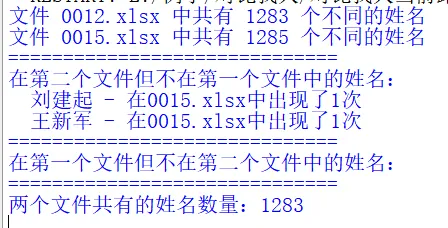 第6-8行:读取数据。header=0表示标题行在第一行,header=None表示将第一行作为数据,而非列名。usecols=[1]表示只读取第2列(从0开始计数列索引),usecols=[0]表示读取第1行。第10-11行:清洗数据,去除单元格的首发的空格。第13-14行:把姓名转换为集合。集合的最大特点是唯一性,不存在重复的元素。第16-17行:通过两个集合的差集,找出各自独有的姓名。第19-22行:显示结果。在这里只找到了仅在0015.xlsx有的两个姓名。下面的代码使用了collections模块,不仅找出了各自独有的姓名,还可以对两个表格中的姓名个数进行统计。import pandas as pdfrom collections import Counterpath1 = "0012.xlsx"path2 = "0015.xlsx"df1 = pd.read_excel(path1, header=0, usecols=[1])df2 = pd.read_excel(path2, header=None, usecols=[0])df2.columns = ["姓名"]n1 = df1["姓名"].astype(str).str.strip()n2 = df2["姓名"].astype(str).str.strip()name_count1 = Counter(df1["姓名"])name_count2 = Counter(df2["姓名"])print(f"文件 {path1} 中共有 {len(name_count1)} 个不同的姓名")print(f"文件 {path2} 中共有 {len(name_count2)} 个不同的姓名")print("="*50)# 找出在path2中但不在path1中的姓名print("在第二个文件但不在第一个文件中的姓名:")for name in name_count2: if name not in name_count1: print(f" {name} - 在{path2}中出现了{name_count2[name]}次")print("="*50)# 找出在path1中但不在path2中的姓名print("在第一个文件但不在第二个文件中的姓名:")for name in name_count1: if name not in name_count2: print(f" {name} - 在{path1}中出现了{name_count1[name]}次")print("="*50)common_names = set(name_count1.keys()) & set(name_count2.keys())print(f"两个文件共有的姓名数量:{len(common_names)}")