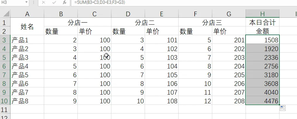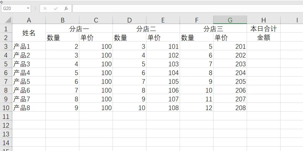 1. 有如下数据,需要求出每个产品本日的销售金额,其实就是:分店一的数量乘以金额+