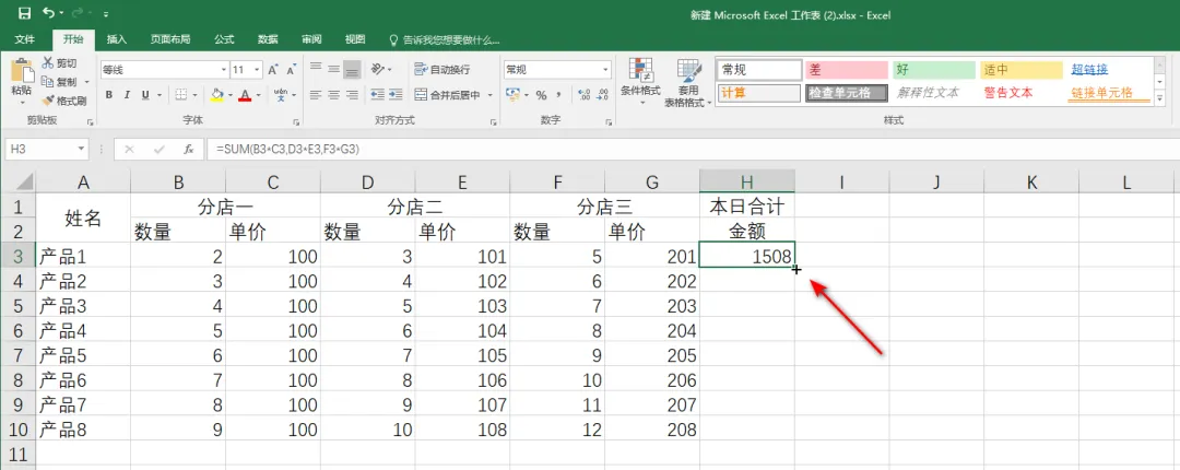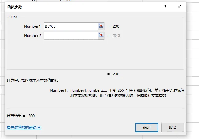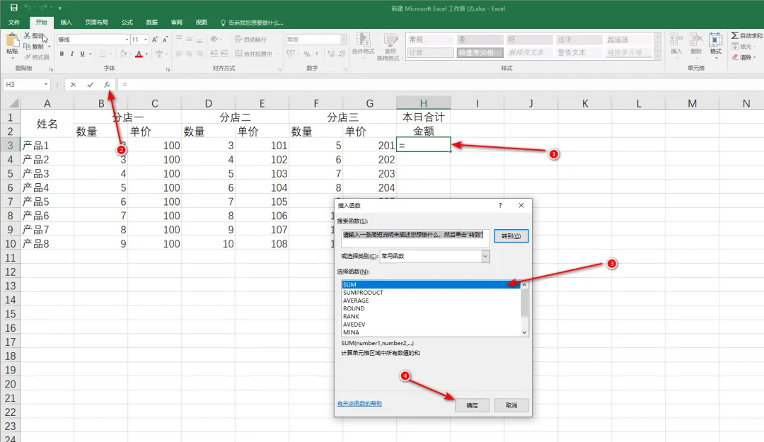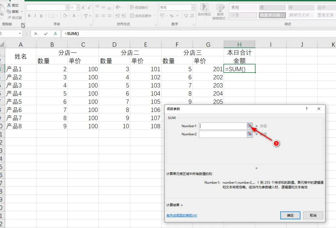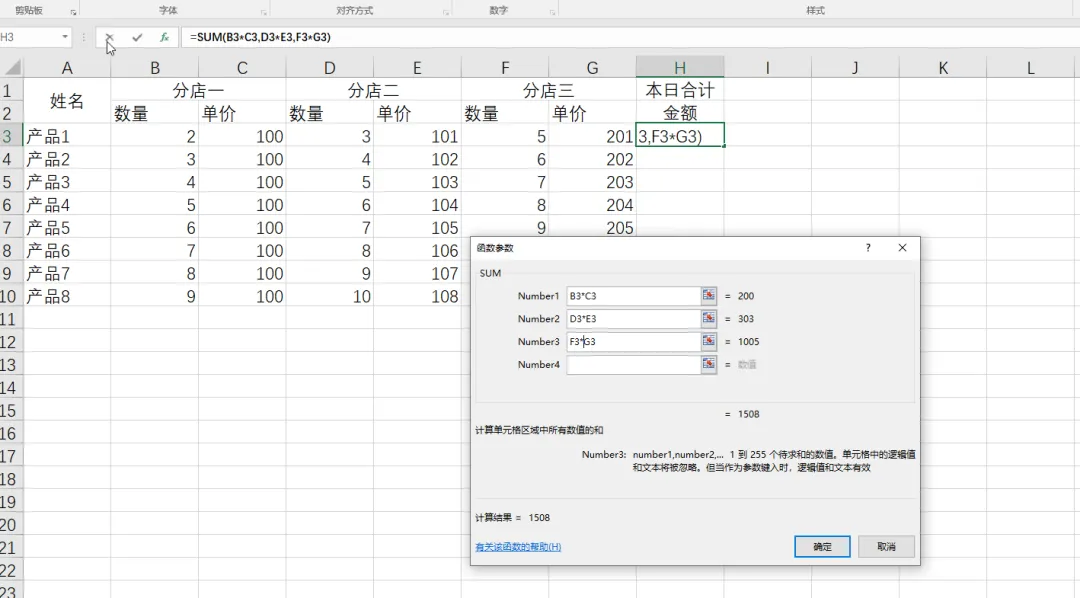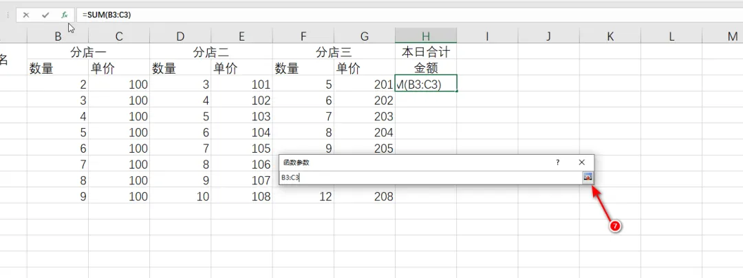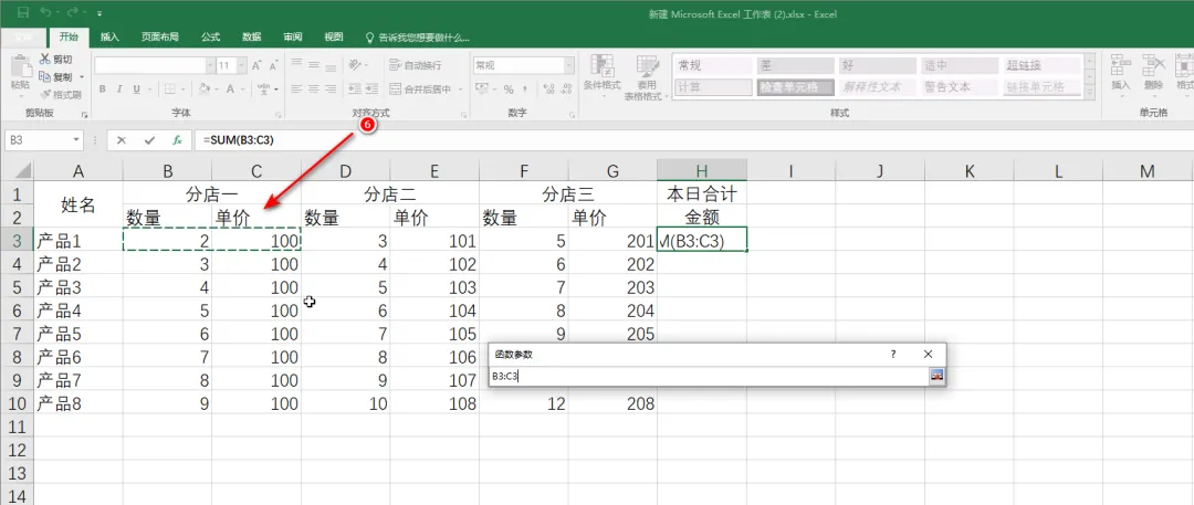 2.6 选择“分店一”的数量和单价,可以看到函数参数中出现了“B3:C3”