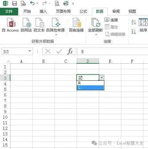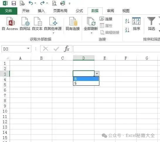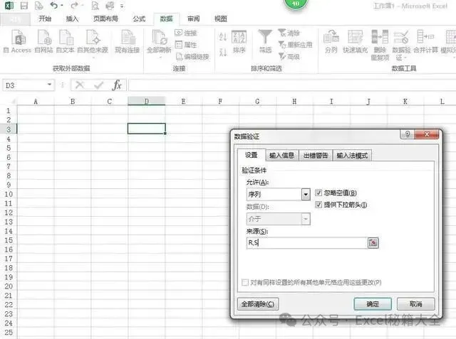 在弹出的对话框中验证条件选择“序列”,来源输入“R,S”,点确定关闭