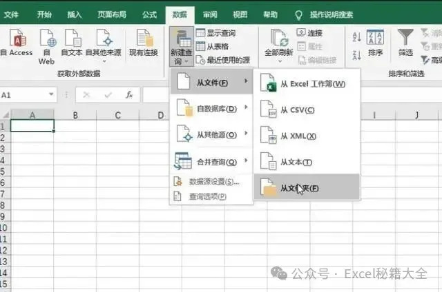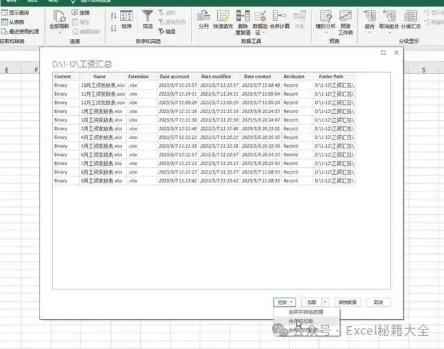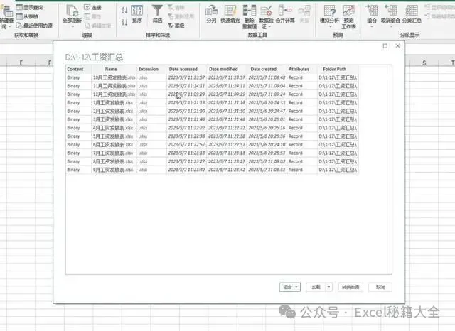 第二步:新建一个excel文件,点击菜单栏中的“数据”→“新建查询”→“从文件”→“从文件夹”(图2),找到刚才的“工资汇总”文件夹,打开,我们现在就看到了刚才的12个文件显示出来了(图3)。