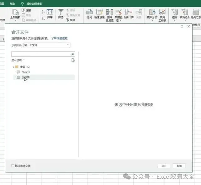 点击右下角的“组合”→“合并和加载”(图4),在出现的合并文件对话框中的参数就是这12个文件的工作表页签的名字,选择你需要合并的工作表的名字,我这里选择“发放表”(图5)。