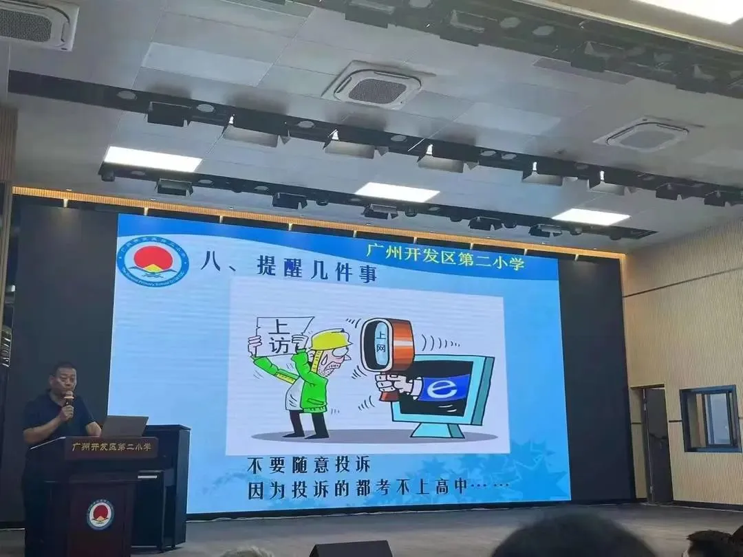 9月11日,一张广州开发区二小新生家长会上的照片引起关注,照片中校领导的演讲PPT显示,“提醒几件事,不要随意投诉,因为投诉的都考不上高中”。