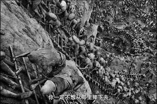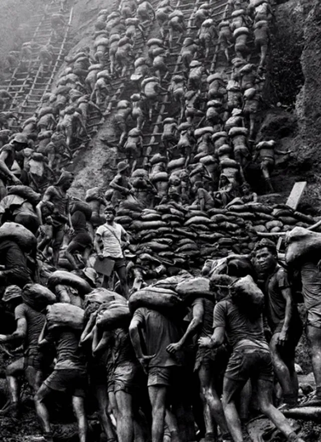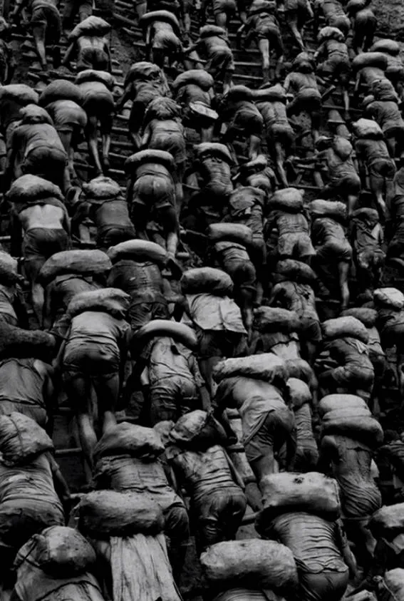 人们扛着一包包的砂土,爬上高高的窄梯,每人每天要往返50-60次。每天都有人从梯子上摔下去,有人摔死有人摔伤…