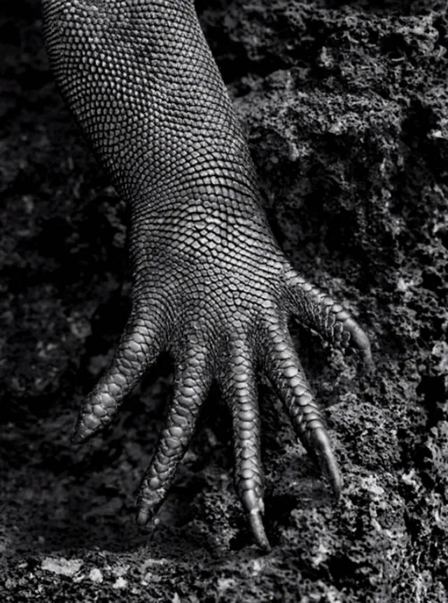 萨尔加多说:你看,这张海鬣蜥的脚,让人想到中世纪武士的手,以及盔甲上的鳞片。看着这张照片,我仿佛觉得海鬣蜥是我的表亲,我们最初都是由相同的细胞进化而来的。