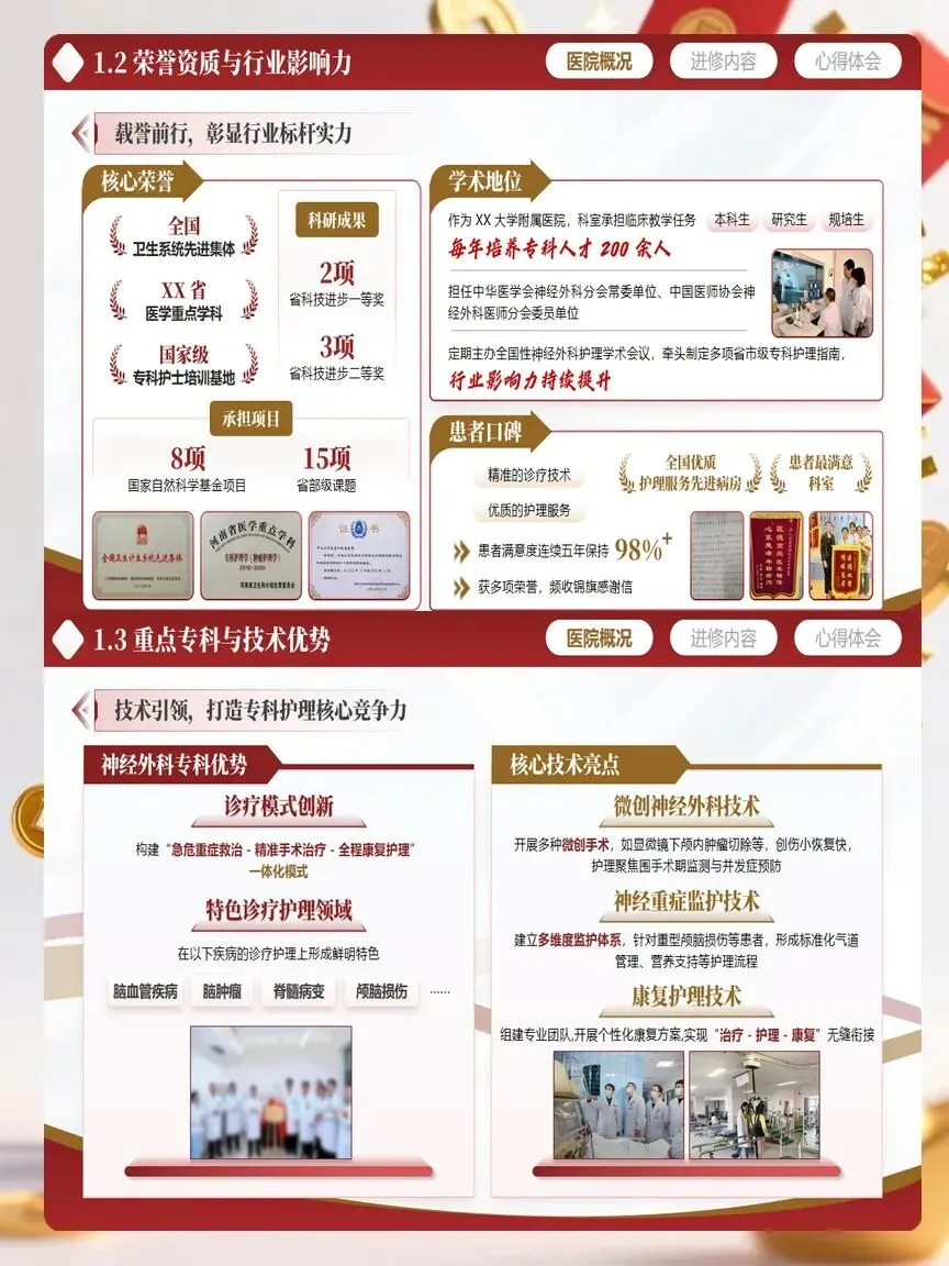 做进修汇报PPT,首先要明确汇报的核心目的——是分享学习收获,还是展示专业成长。在开头部分,用简洁的语言介绍进修的背景、时间和地点,让听众快速了解汇报的基础信息。比如可以这样开场:“这三个月我在XX医院重症监护室进修,系统学习了急危重症护理技术,今天就和大家分享我的进修收获。”