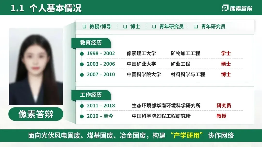 汇报人是教授 / 博导,教育与工作经历覆盖矿物加工、矿业工程、材料科学等领域,目前在中科院过程工程研究所工作,长期面向光伏风电、煤基、冶金固废,搭建 “产学研用” 协作网络,专业背景与研究方向高度匹配。