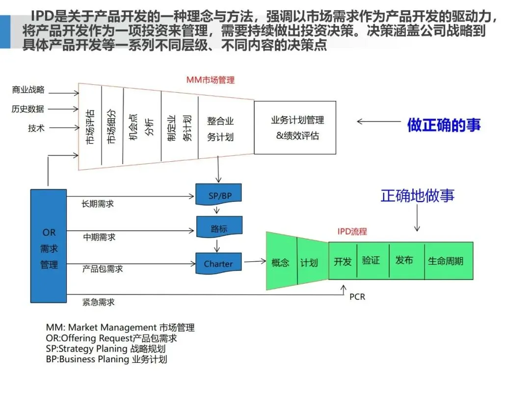 IPD(Integrated Product Development)即集成产品开发,是一种强调以市场需求作为产品开发驱动力,将产品开发作为一项投资来管理的理念和方法。它要求企业持续做出投资决策,确保产品开发符合公司战略方向,同时实现财务和市场目标的双重成功。