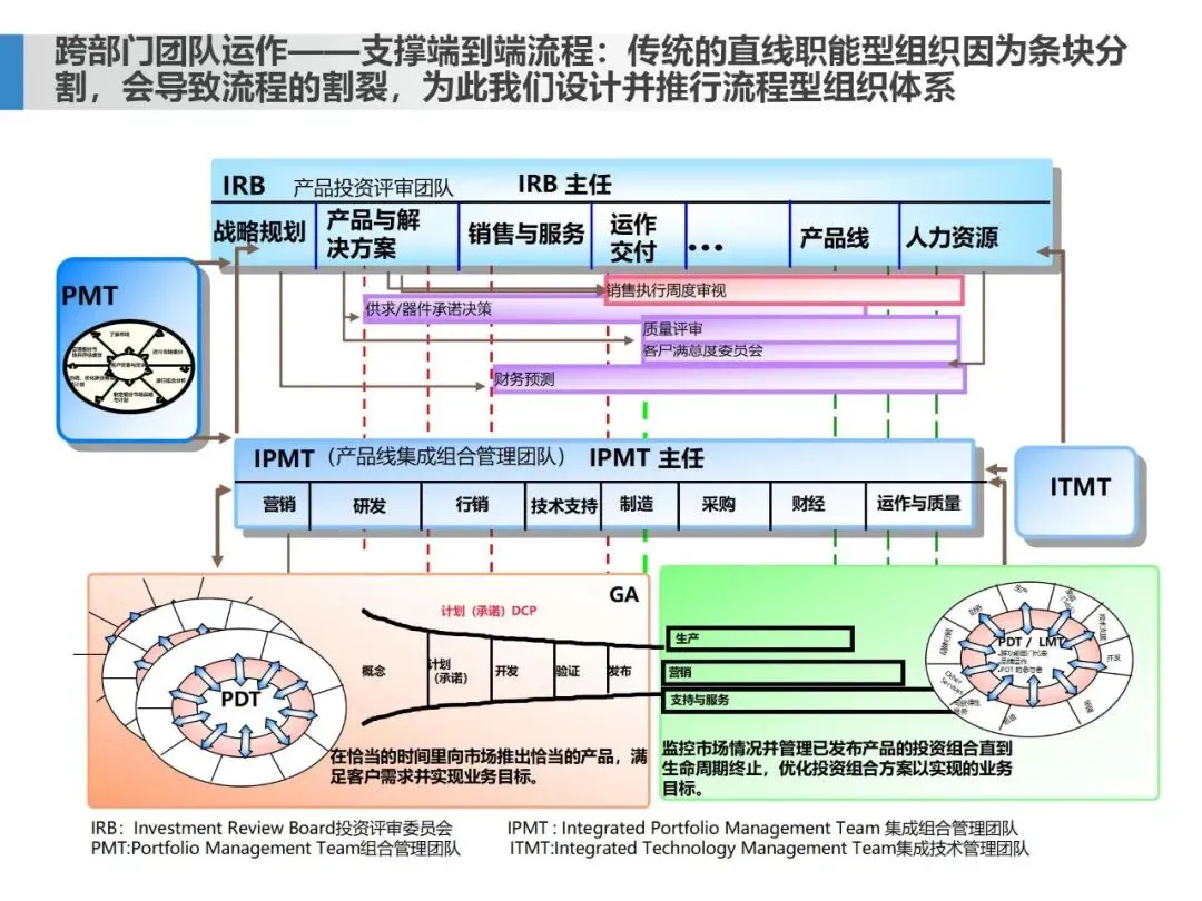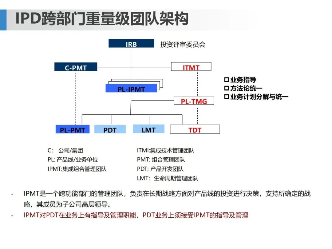 IPMT(Integrated Portfolio Management Team)即集成组合管理团队,是一个跨功能部门的管理团队,负责在长期战略方面对产品线的投资进行决策。其成员通常包括子公司高层领导,涵盖市场、研发、采购、供应链、销售、服务等多个领域,确保决策的全面性和专业性。