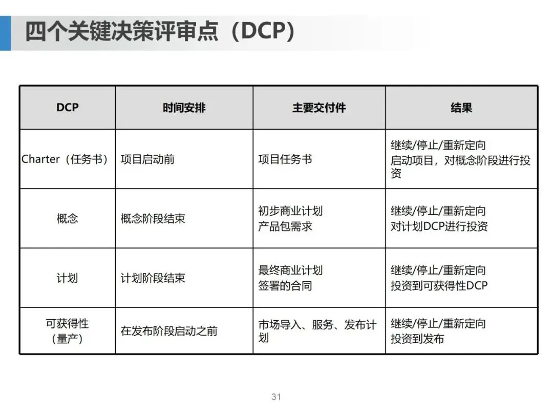 计划决策评审(PDCP):计划阶段结束时,确认最终业务计划和产品开发合同。