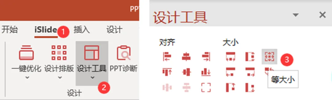 点击 iSlide,选择【设计工具】,在右侧的工具栏中选择【等大小】即可。(等大小会以最后选择的图片为基准)