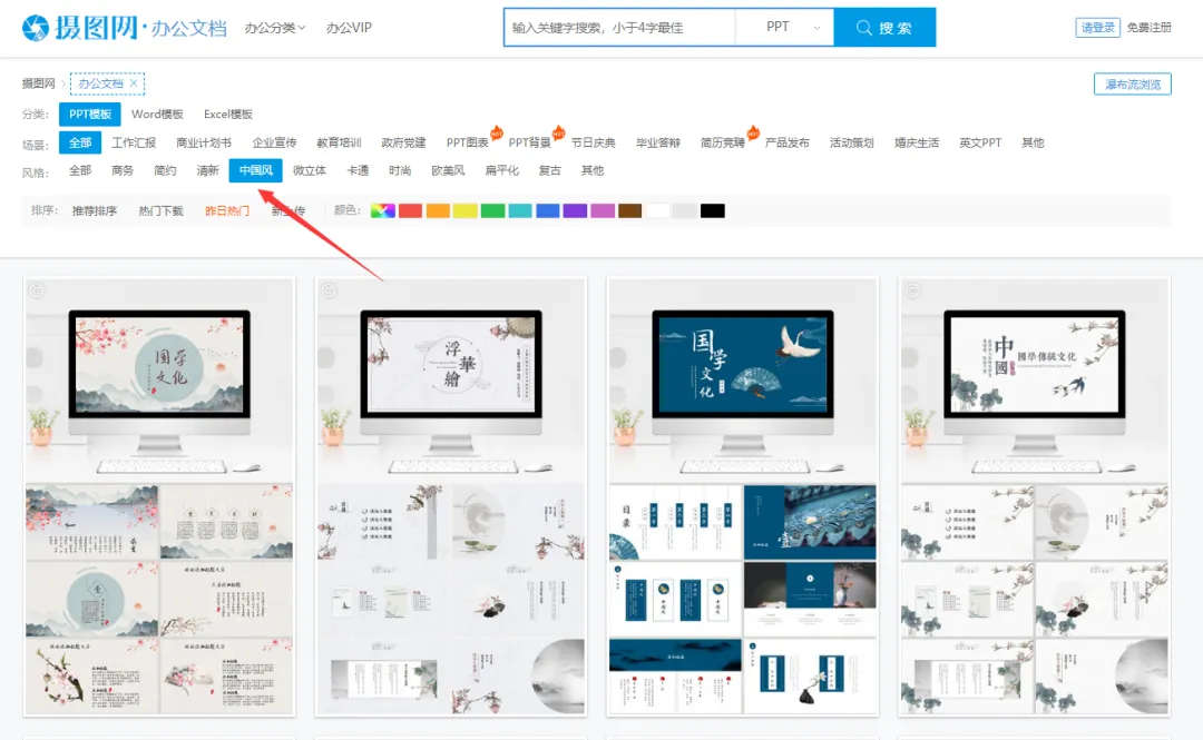 正确的做法是,有针对性地选择模板进行下载使用,比如我们要下载一个中国风 PPT 模板,直接在模板网站的分类中选择中国风类别: