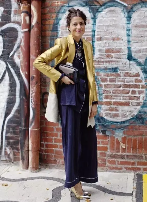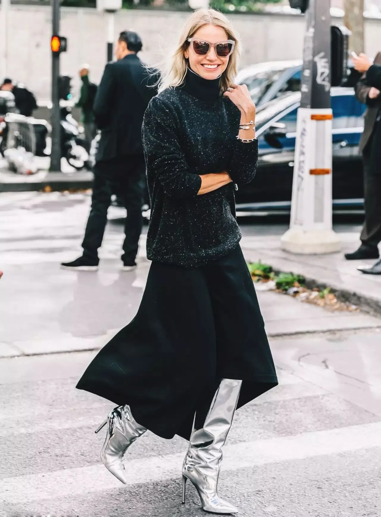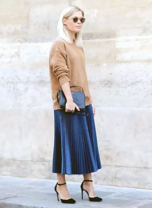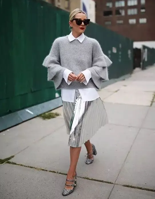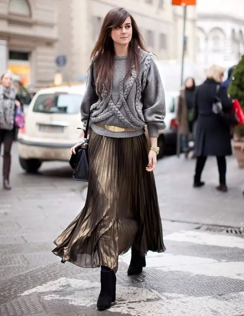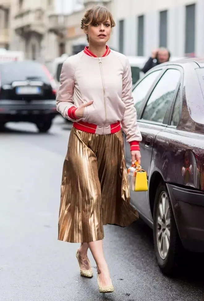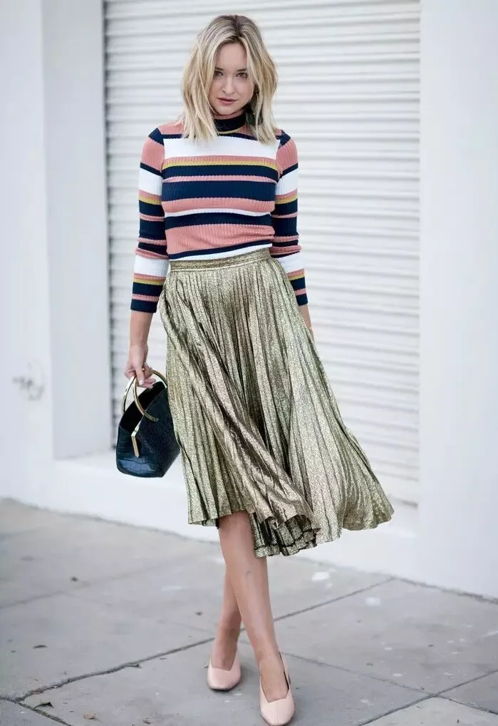 不显臃肿的简单上装巧搭亮丽的金属色百褶裙,