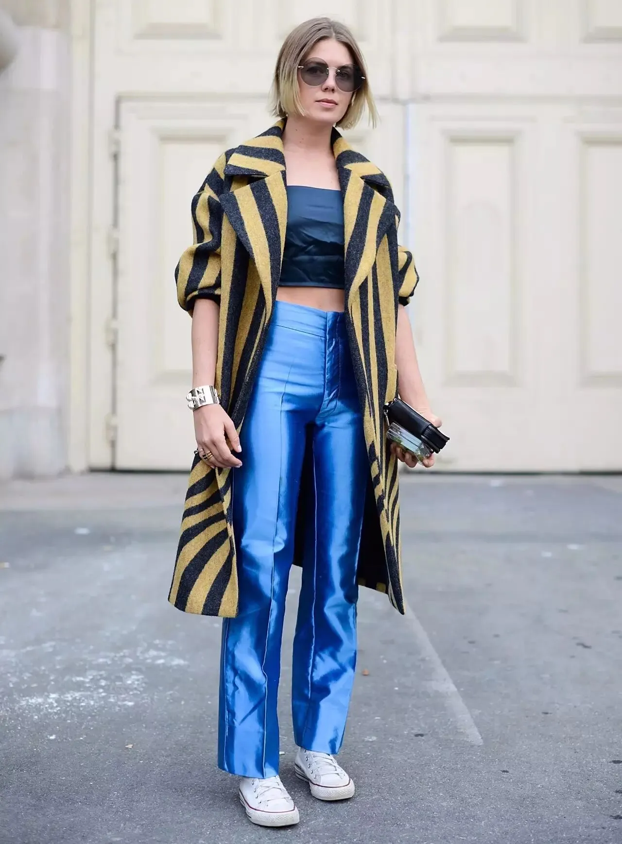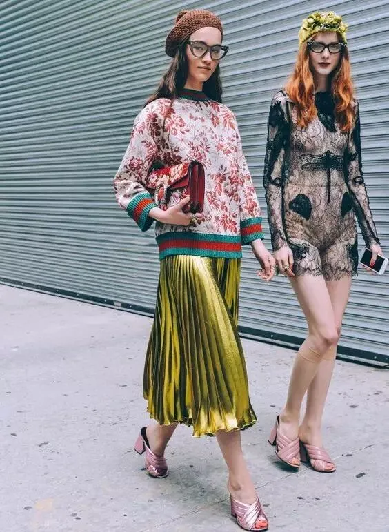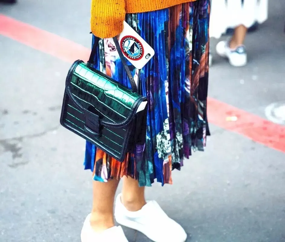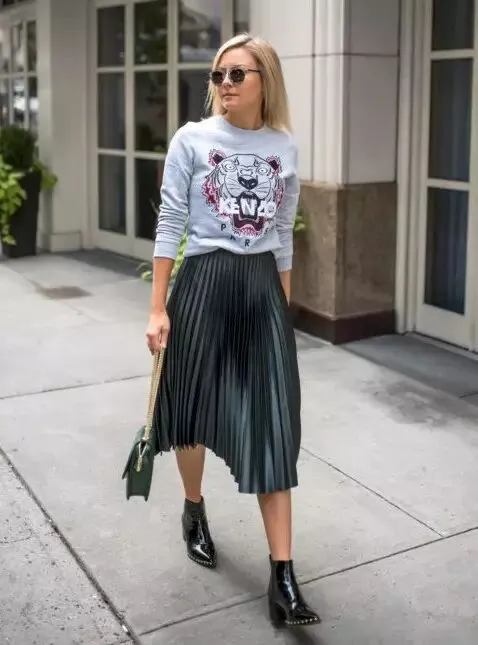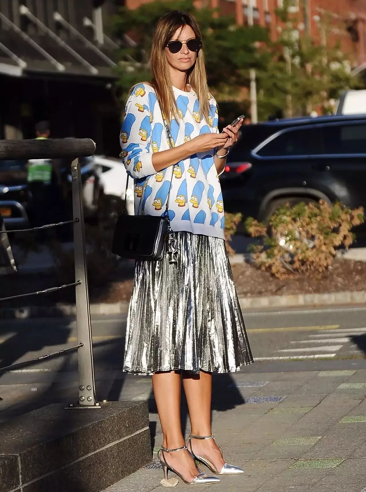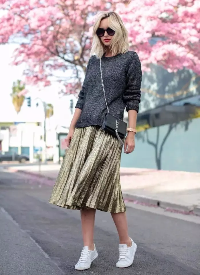 将抢眼的金属色百褶裙与个性的卫衣结合,